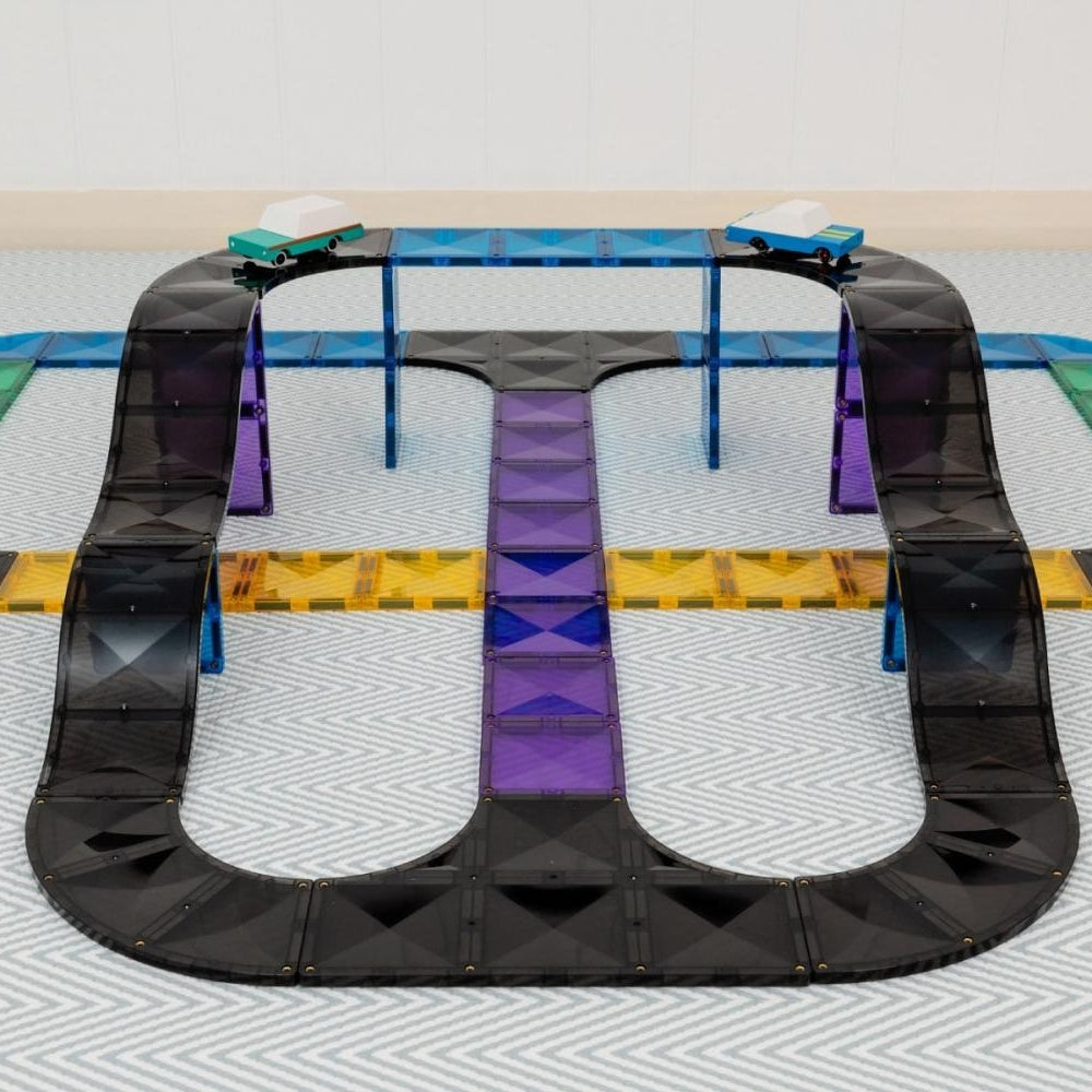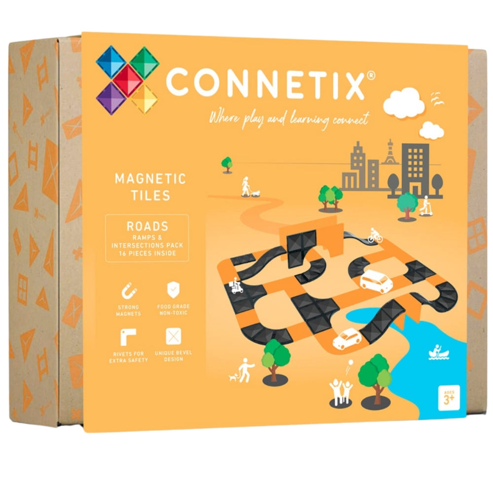 L'ensemble Connetix de 16 pièces Roads, Ramps and Intersections présente des formes uniques de tuiles magnétiques inspirées des routes, notamment des quarts de cercle, des courbes, des intersections et des rampes longues et courtes, le tout dans une teinte noire élégante.