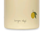 Une superbe bouteille thermos Konges Sløjd pour enfants avec un joli design citron et deux bouchons interchangeables.