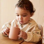 Le bavoir à manches Liewood a un joli motif pêche beige.