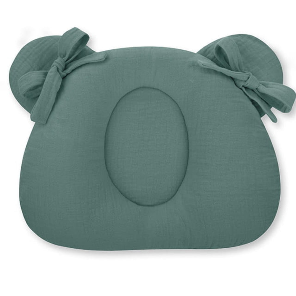 L'oreiller pour bébé Sleepee est fabriqué en mousseline de coton douce et a la forme d'une tête d'ourson.