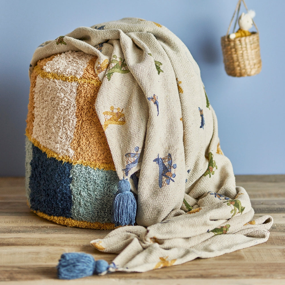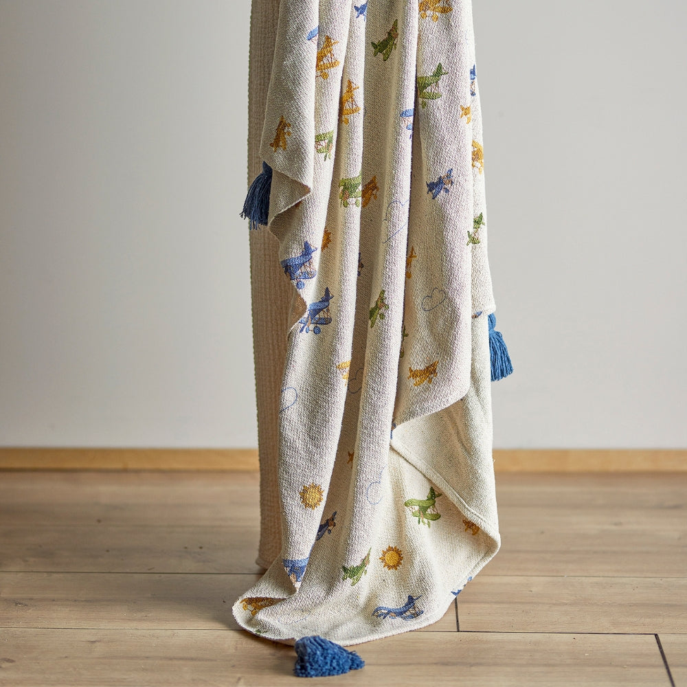 Cette couverture décorative de la collection Plane s'intègre parfaitement dans une chambre d'enfant, mais peut également être utilisée comme couvre-lit dans un salon.