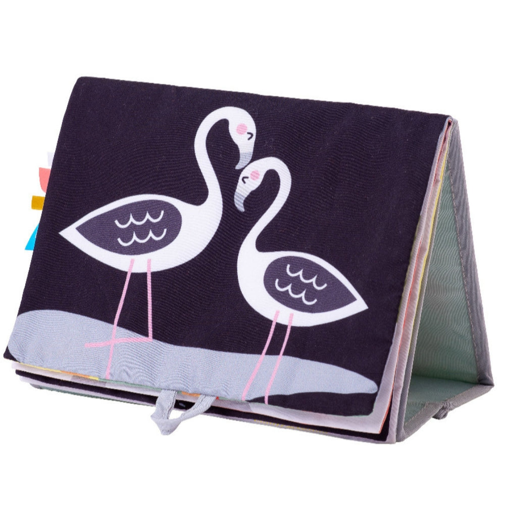 Un livre interactif tout doux de taf toys pour les bébés, avec deux pages pour deux stades de développement, à utiliser dans le lit, la poussette et pour jouer dans le ventre.