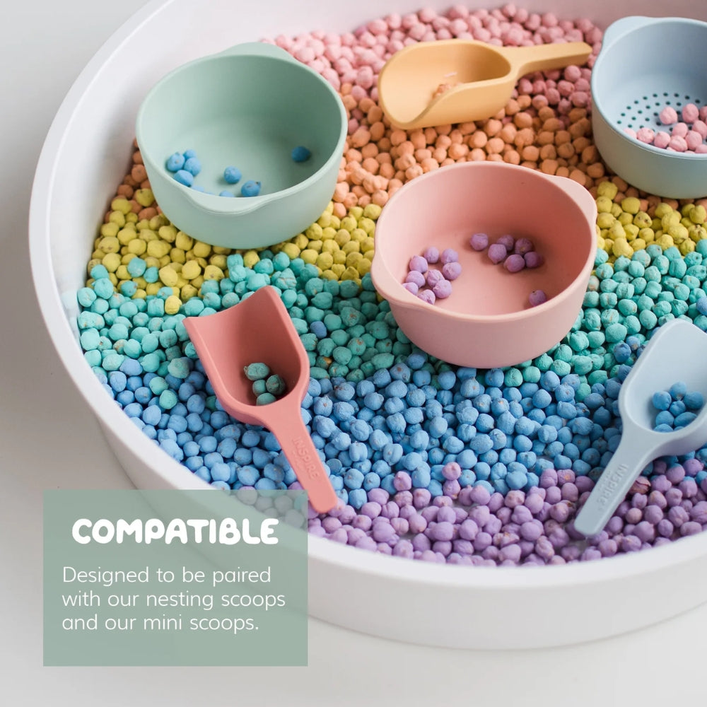 Elles peuvent être utilisées pour diverses activités sensorielles, comme le tamisage du riz, des lentilles ou des pois chiches, ainsi que pour jouer dans l'eau ou dans le bac à sable.