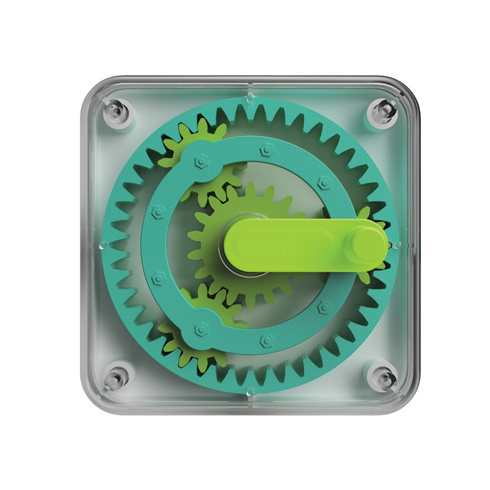 Grâce à un mécanisme actionné par une manivelle, un jeune enfant peut regarder la grande roue faire bouger les trois petites roues, ce qui lui procure une grande satisfaction et l'encourage à expérimenter.
