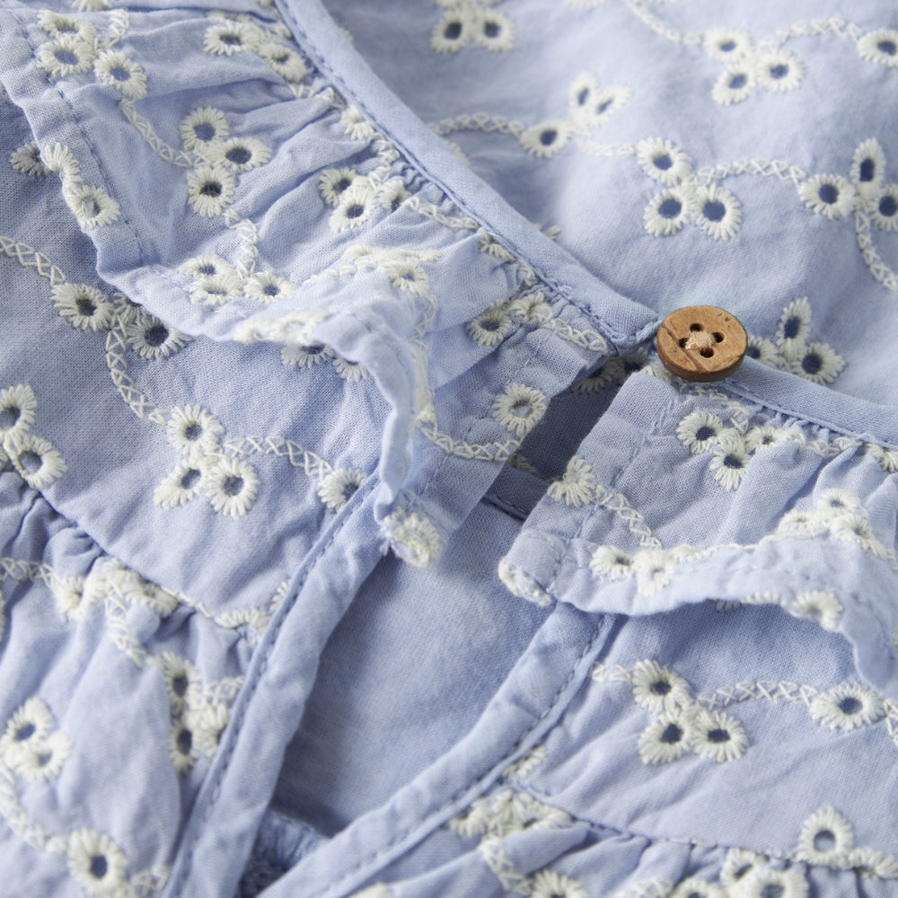 Le volant subtil ajoute une touche girly, et la couleur bleue classique fait de la blouse pour bébé un vêtement parfait pour tous les jours et les occasions spéciales.