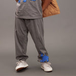 La couleur grise est interrompue par un adorable motif de dinosaure bleu avec des détails roses, qui confère au pantalon une touche de gaieté.