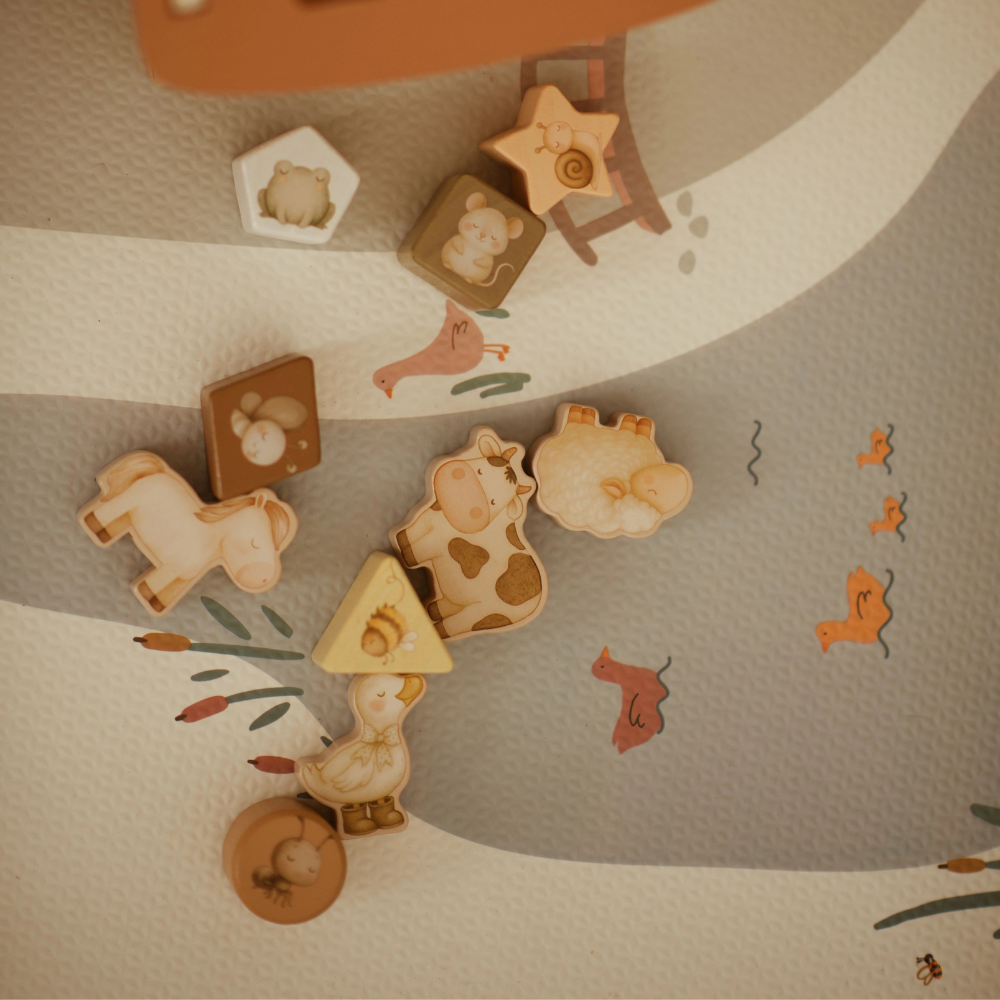 L'ensemble de Mme Ertha contient 13 pièces en forme d'animaux et d'objets de la ferme, qui peuvent être arrangés, déplacés et se voir raconter leur propre histoire - ce qui est idéal pour exercer la concentration et l'imagination.