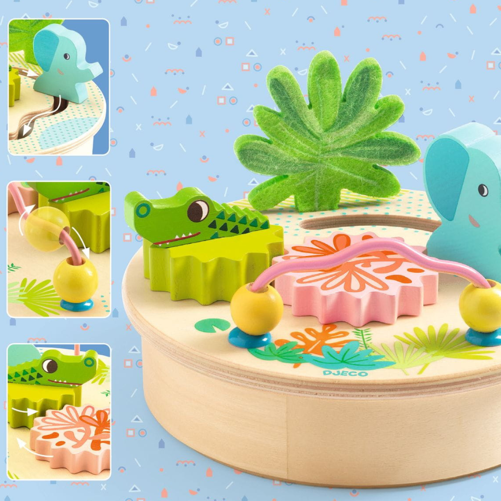 Sur la table ronde, vous trouverez des perles coulissantes, un éléphant qui se cache derrière des buissons et des engrenages de crocodile.