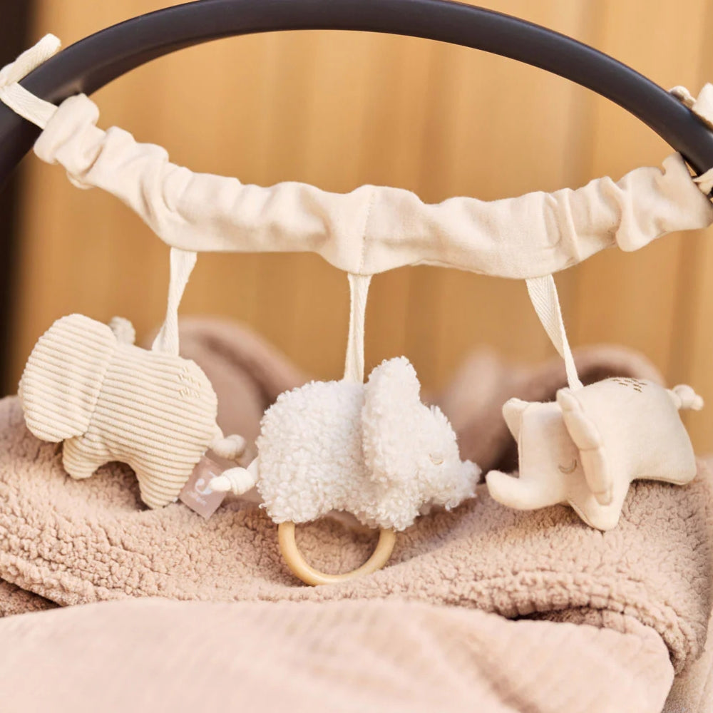 Le pendentif du landau est composé de trois éléphants sympathiques, chacun ayant un aspect et une texture différents, ce qui encourage bébé à toucher et à découvrir de nouveaux stimuli.