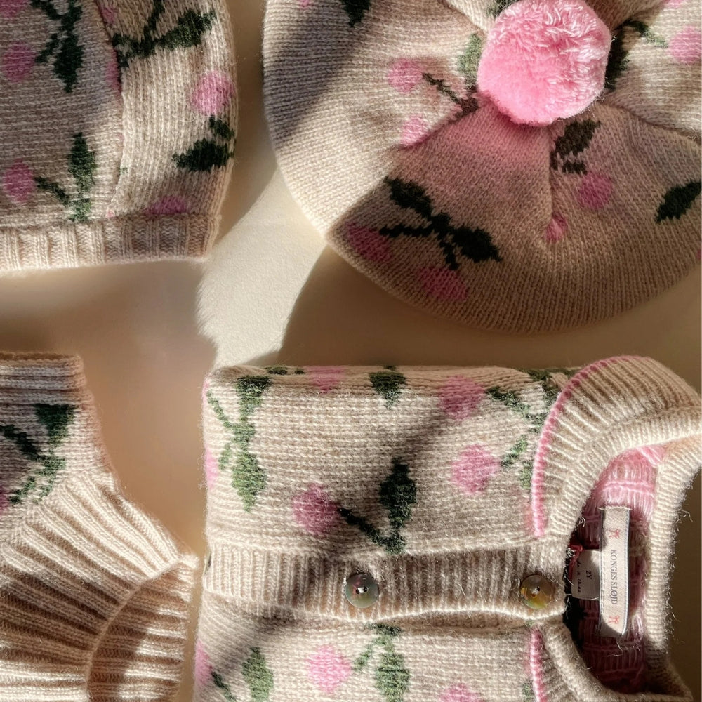 L'adorable motif de cerises roses et de feuilles vertes lui confère un charme unique et fait de ce béret un élément non seulement pratique mais aussi accrocheur de la garde-robe de l'enfant.