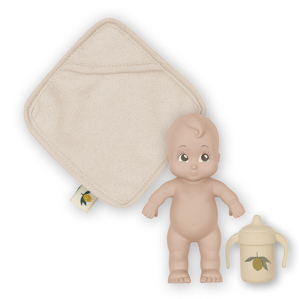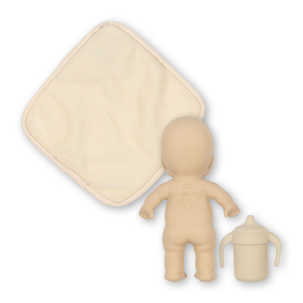 Fabriquée en caoutchouc 100 % naturel, cette poupée est douce au toucher et parfaite pour les petites mains. Une mini-serviette et un biberon sont inclus.