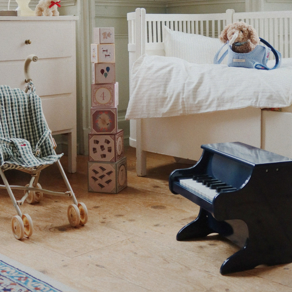 Cette poussette pour poupée a été conçue par Konges Slojd en pensant aux petites personnes qui s'occupent des enfants et aux longues promenades dans la maison.