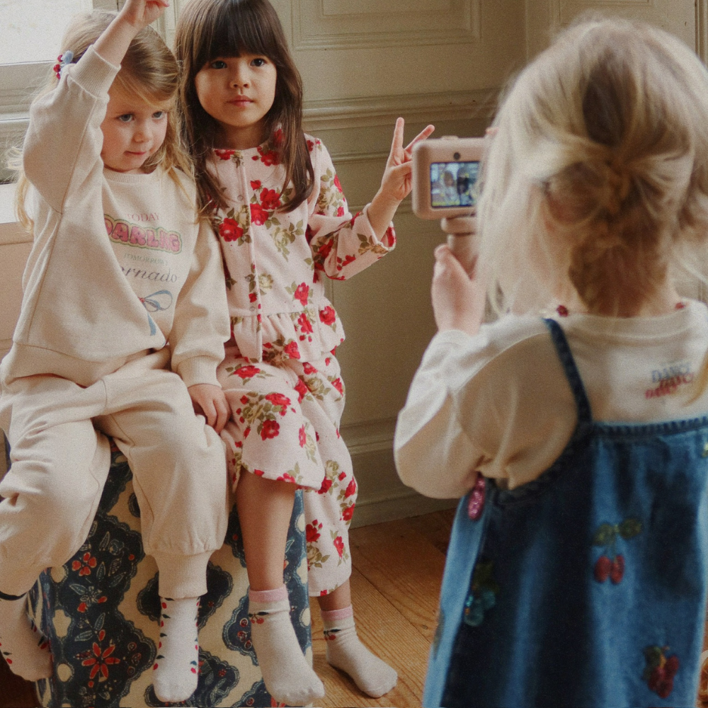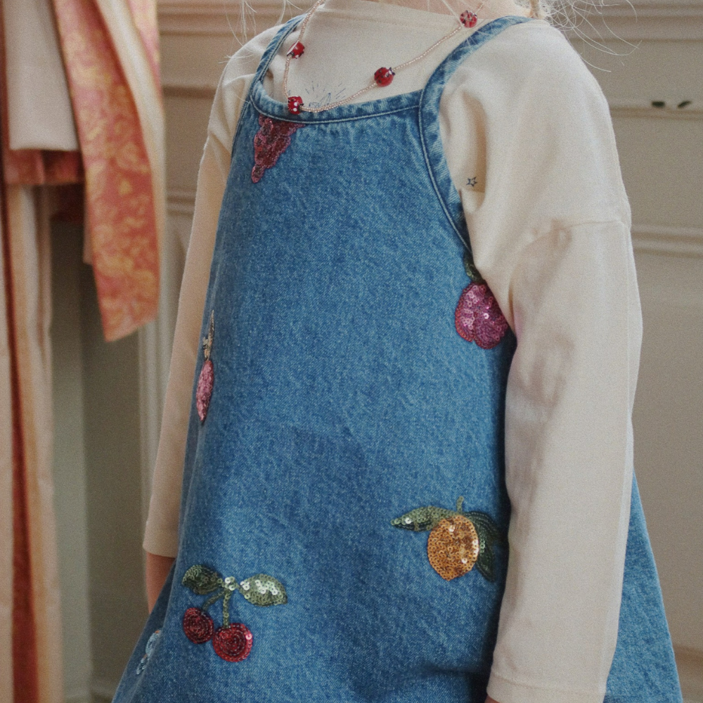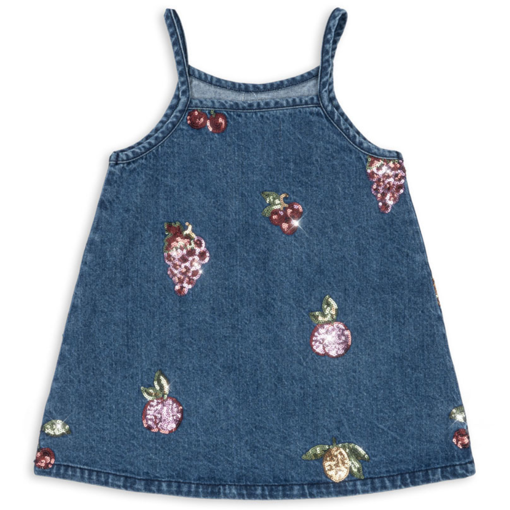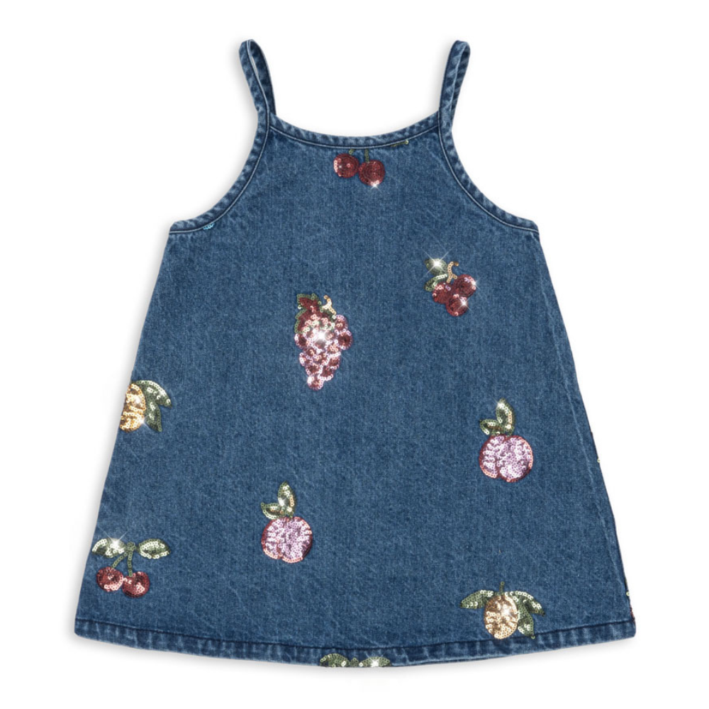 Cette robe en denim pour enfants de Konges Slojd impressionne par sa brillance subtile. Les fruits brodés et pailletés ajoutent à son charme et confèrent à toute tenue une touche estivale et ludique.