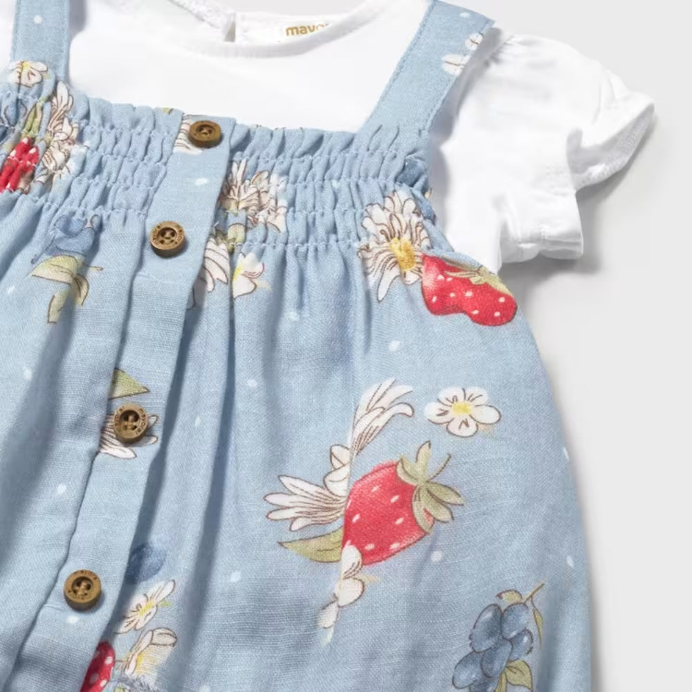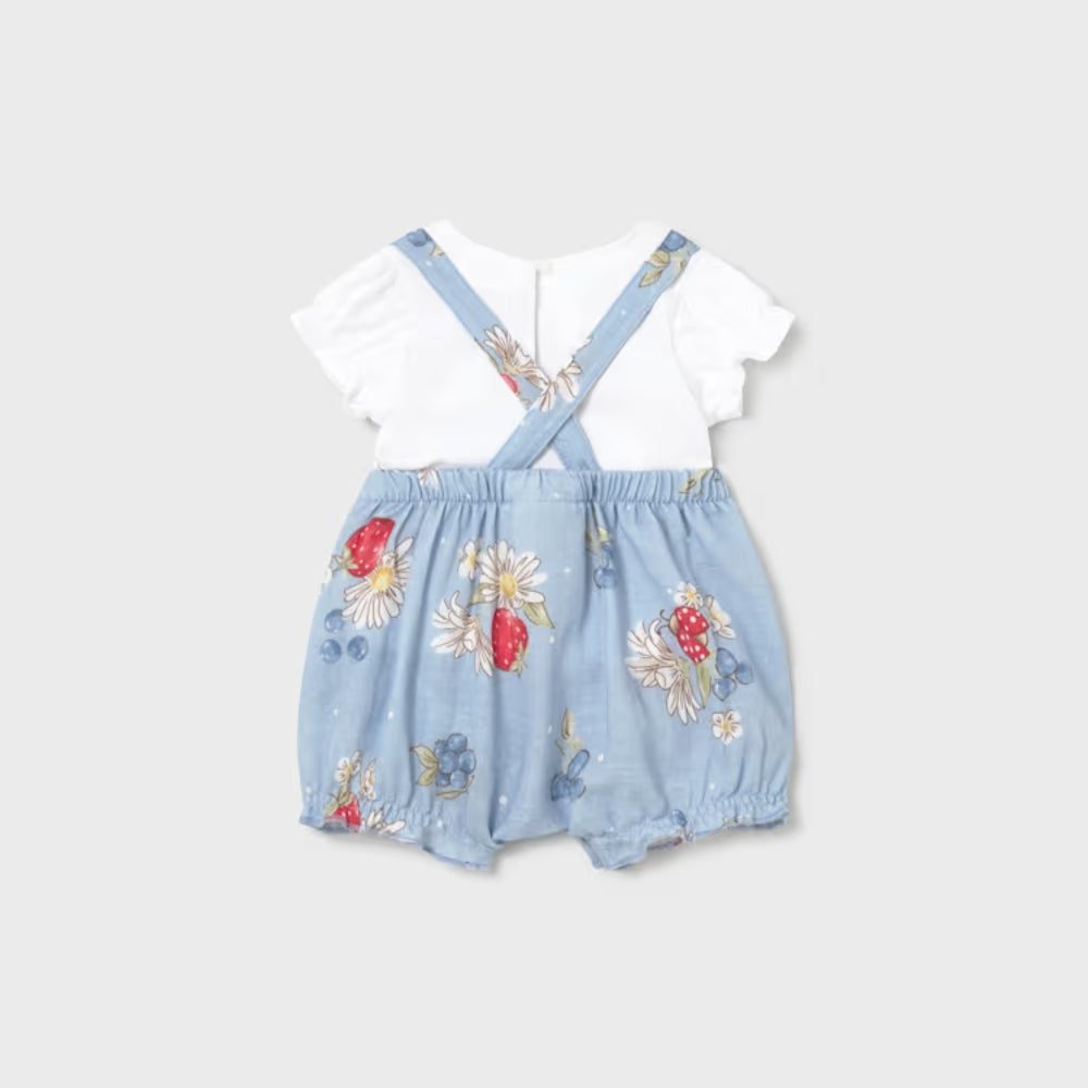 L'ensemble se compose d'une salopette et d'un tee-shirt, créant un style cohérent préparé par Mayoral avec le confort du bébé à l'esprit.