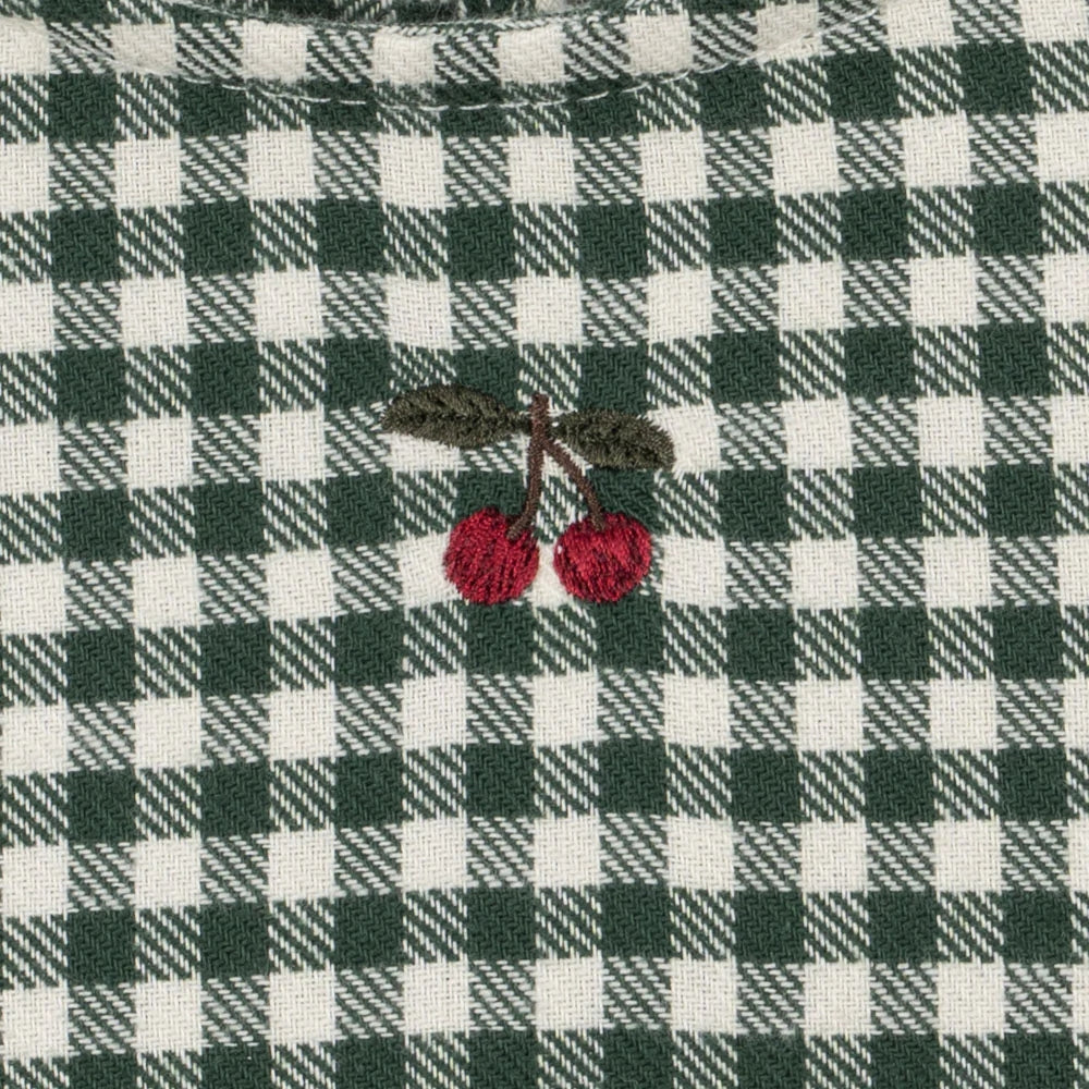 Le motif à carreaux vert et crème classique lui confère un charme intemporel, tandis que la cerise brodée sur le devant est un subtil détail signature de la marque.