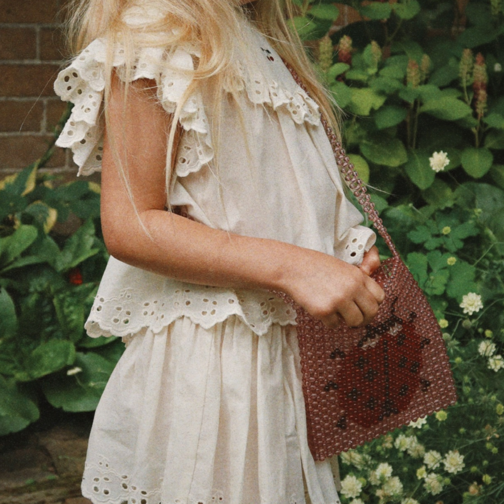 Le sac à bandoulière fait à la main, avec sa fine lanière et sa coccinelle ornée de perles, est un adorable accessoire de Konges Slojd qui complète le style estival des petits explorateurs.