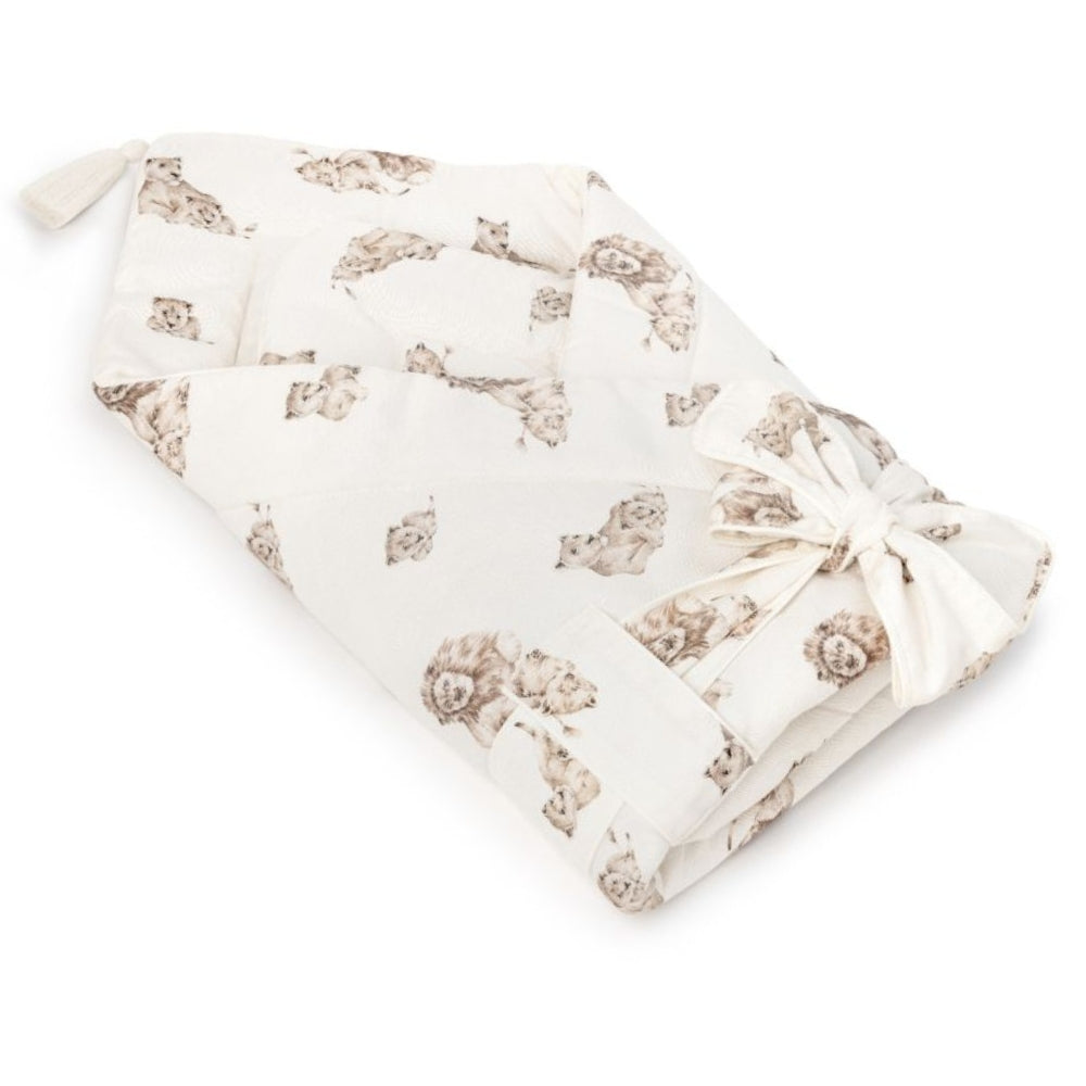 Le modèle de la collection Lions, orné d'une frange naturelle, se distingue par son design subtil inspiré de la nature et s'harmonise parfaitement avec les autres articles de la layette.