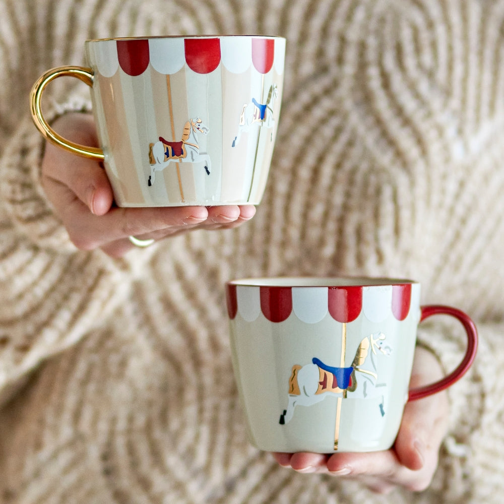 Chaque tasse à café est décorée d'un motif de carrousel et les détails peints à la main rendent chaque pièce unique.