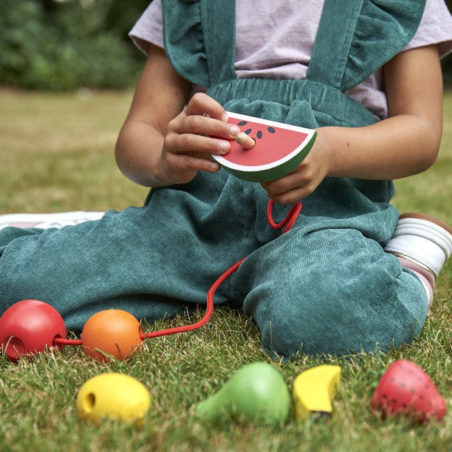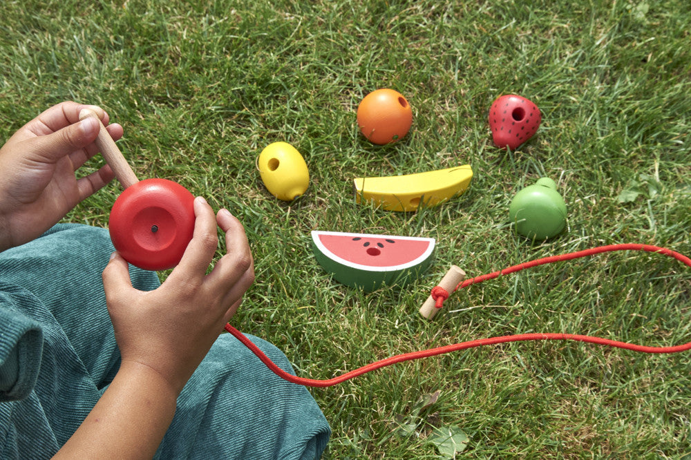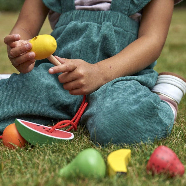 Chaque fruit a des trous pour l'enfiler et deux ficelles avec des enfileurs et des stoppeurs en bois, ce qui permet à votre enfant de créer des suspensions uniques.