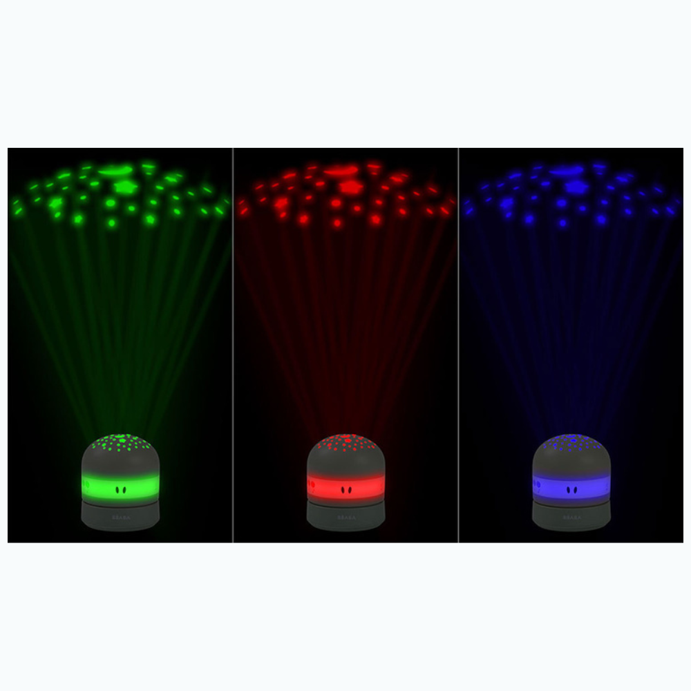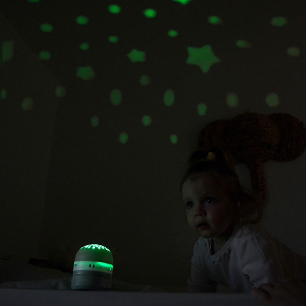 L'appareil Beaba projette des étoiles en trois couleurs - rouge, vert, bleu - avec un choix de lumière constante, changeante ou aléatoire. L'angle de projection réglable vous permet de diriger l'image vers le plafond, le mur ou l'endroit de votre choix - exactement là où votre bébé aime regarder avant de s'endormir.