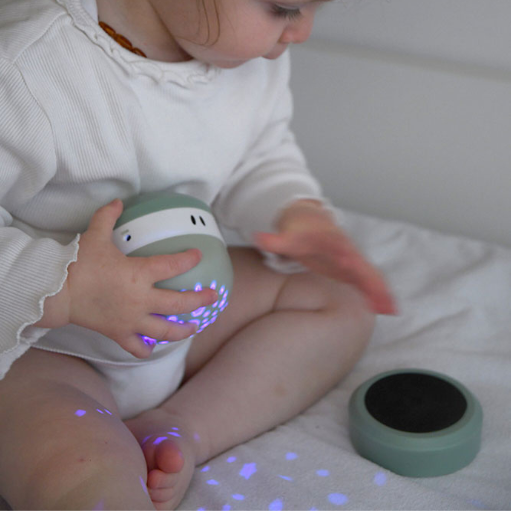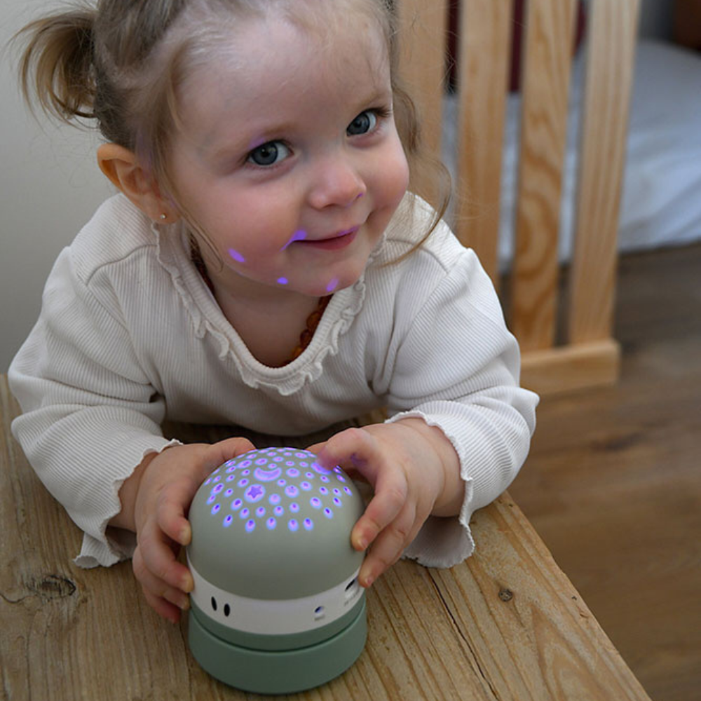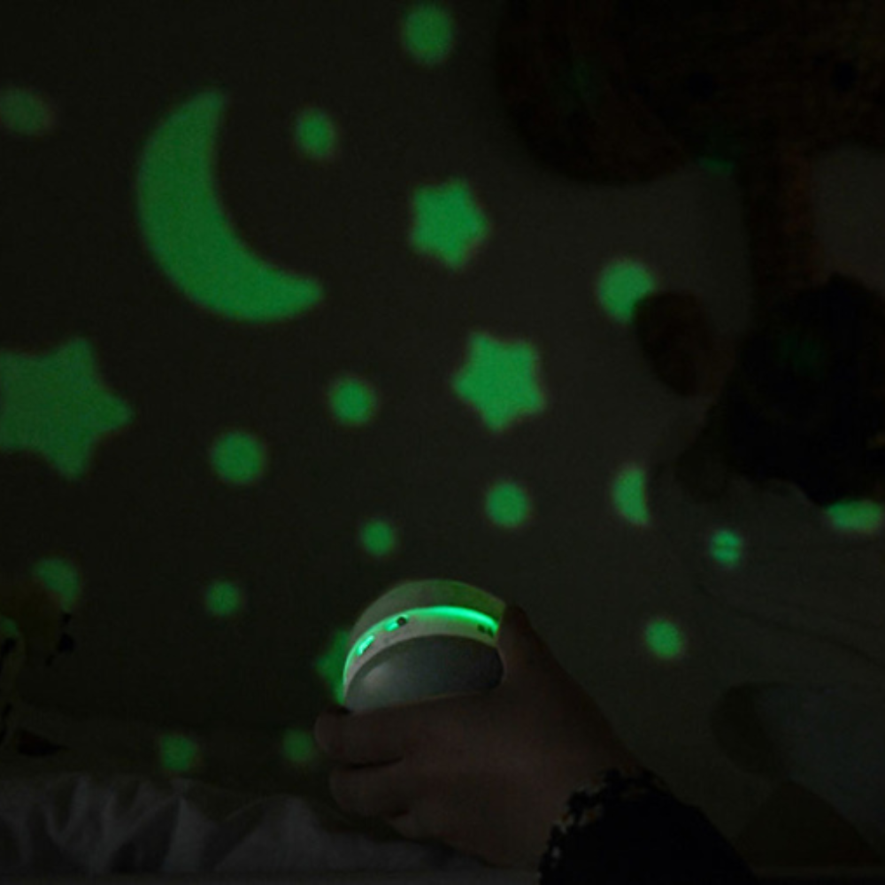 Ce projecteur compact aide votre enfant à se calmer avant de se coucher en l'enveloppant d'un doux ciel étoilé et de sons apaisants.