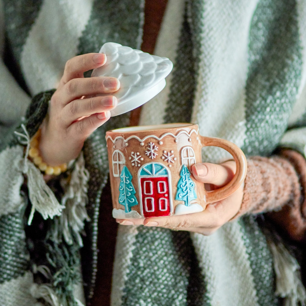 Le modèle Ginnie, avec son charmant design de maison en pain d'épices et son couvercle pratique, garde votre café, votre thé ou votre chocolat chaud au chaud plus longtemps.