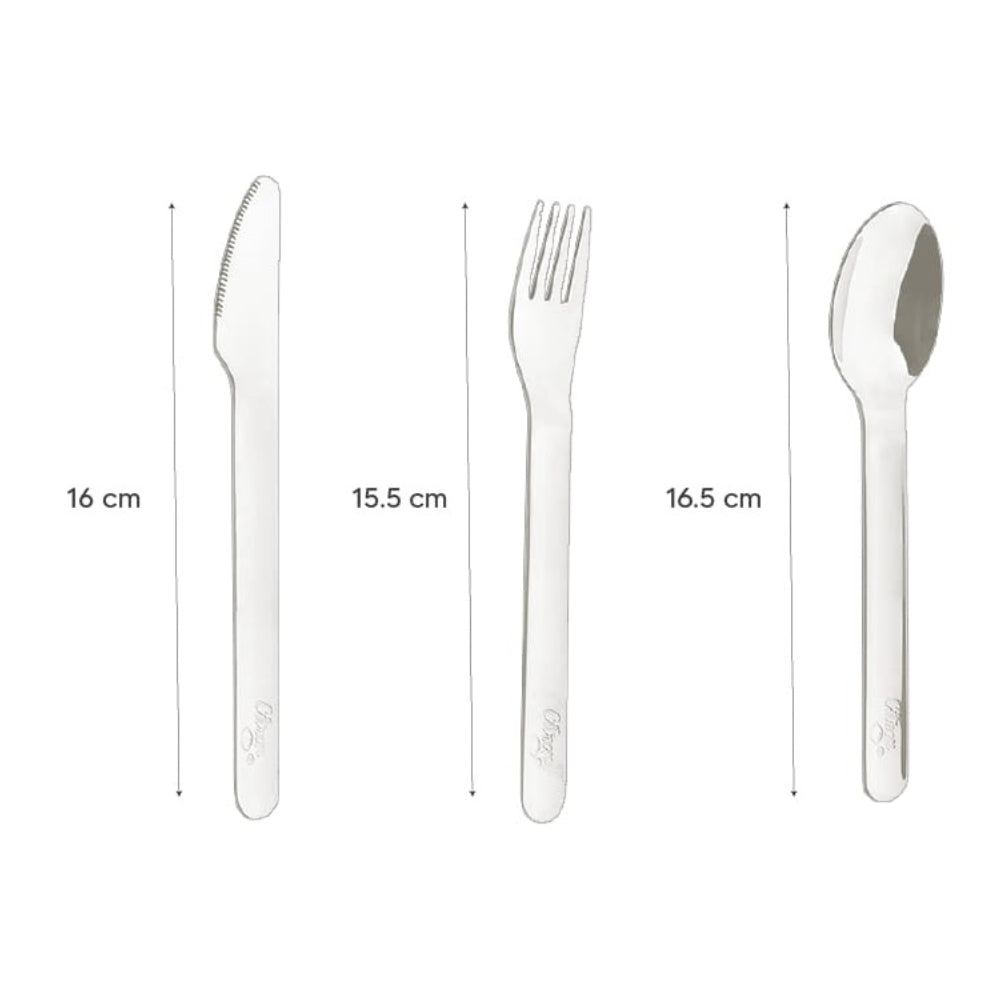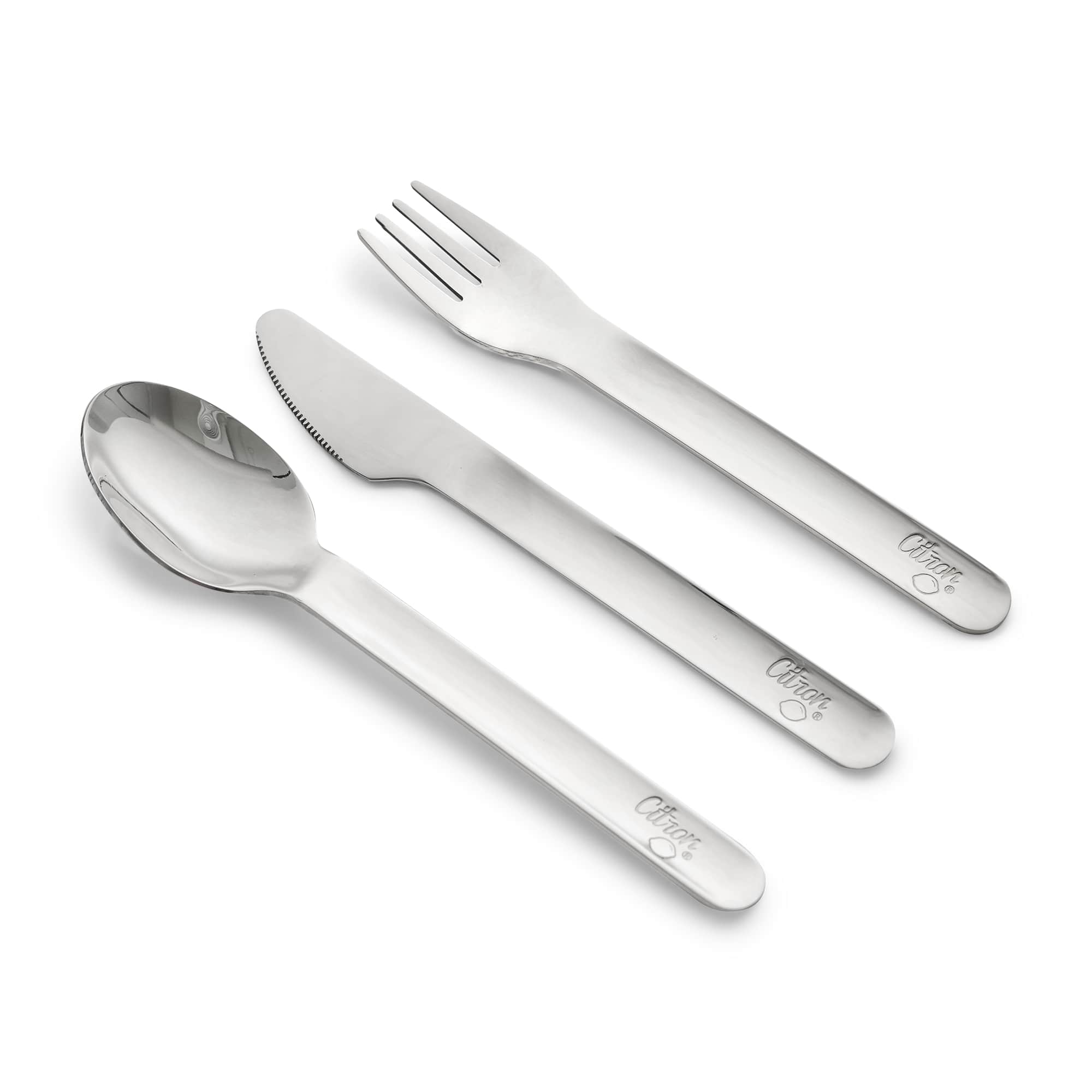 L'ensemble comprend une fourchette, un couteau et une cuillère en acier inoxydable 304 de haute qualité, le tout dans une pochette compacte en silicone dotée d'une fermeture à glissière pratique.