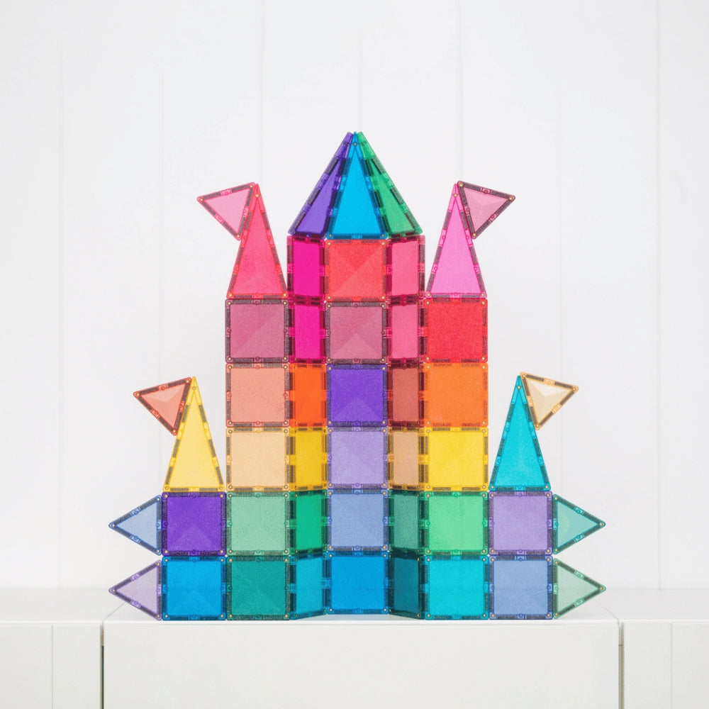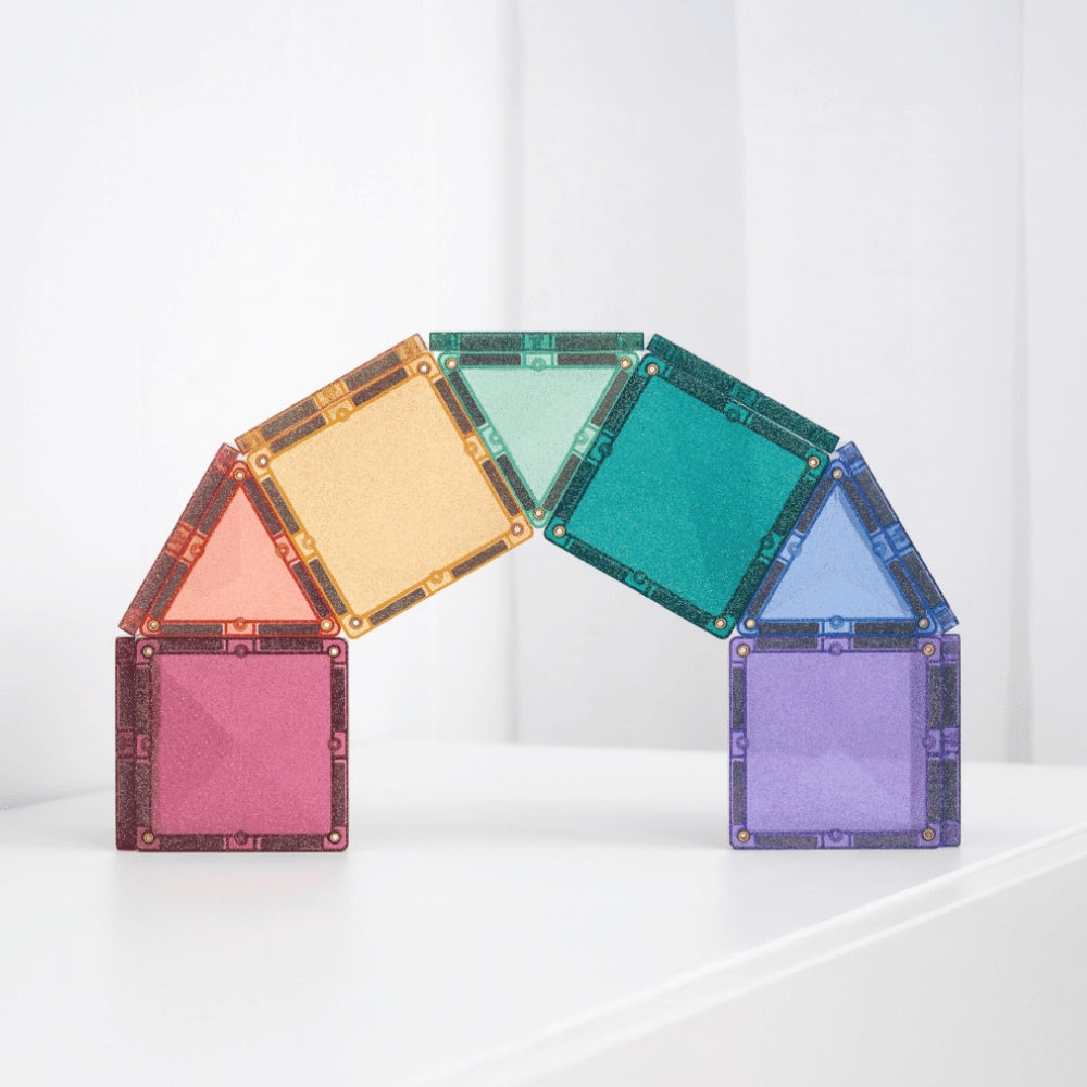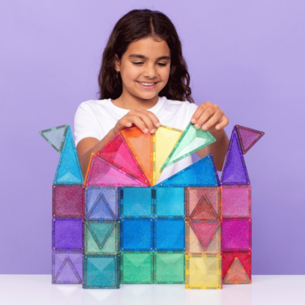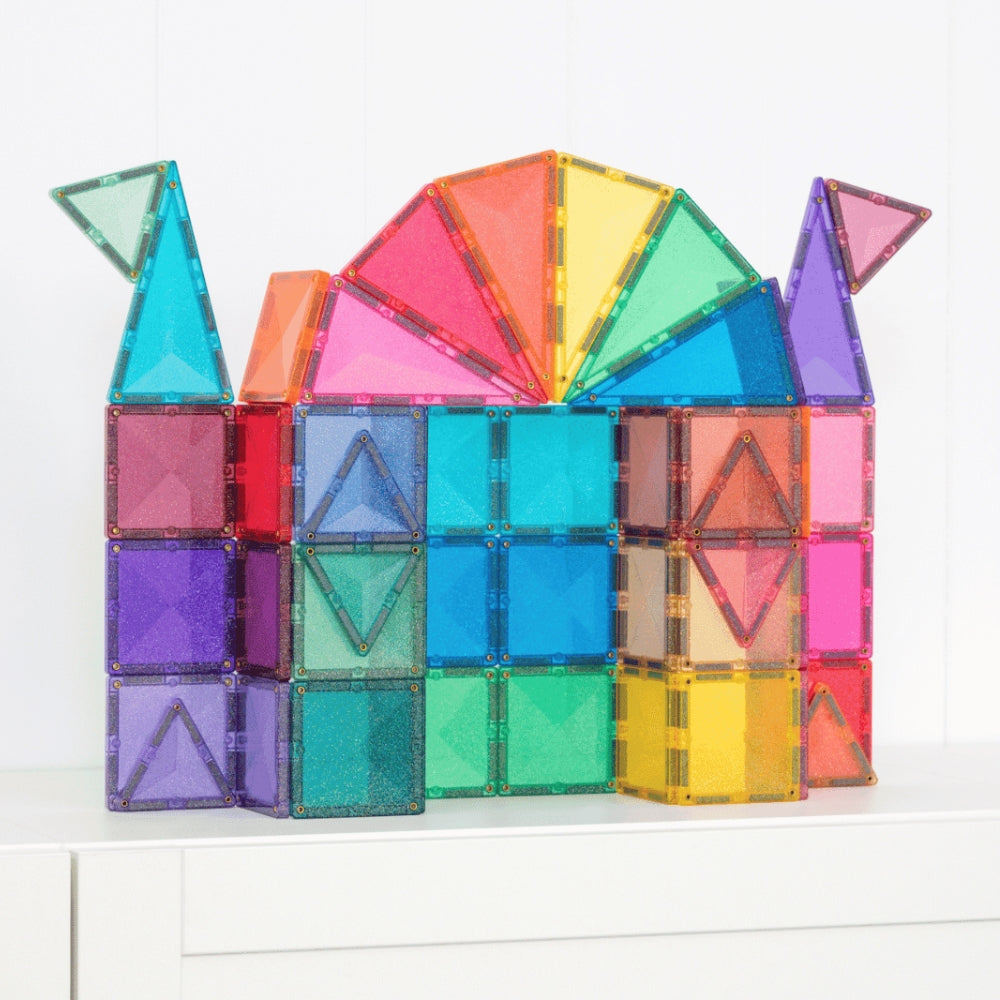 Conçues pour les petits explorateurs et les voyageurs de contes de fées, les tuiles pailletées aux couleurs pastel et arc-en-ciel ajoutent une touche de magie à toute construction. Les blocs magnétiques avec des carrés et des triangles (équilatéraux et isocèles) scintillent de paillettes multicolores, ce qui permet aux enfants de créer des châteaux, des ponts, des tours, des animaux et tout ce que leur imagination leur permet d'imaginer.