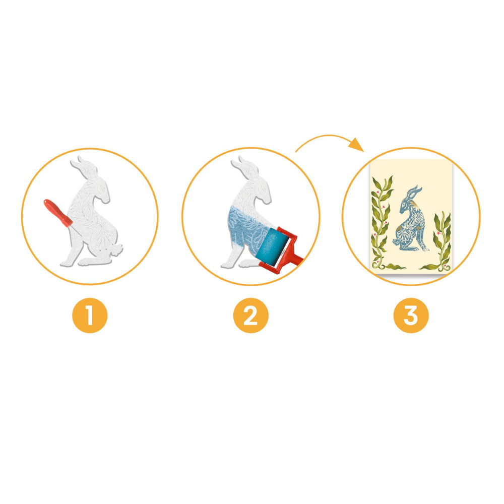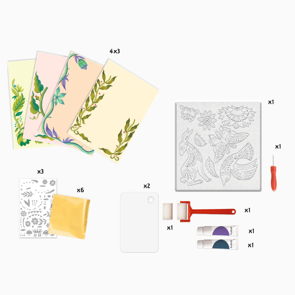 - Contenu du jeu: 12 cartes illustrées d'un motif floral, 8 tampons à graver, 1 poinçon, 2 tubes de peinture gouache, 2 rouleaux en mousse, 2 palettes, 6 feuilles de film de transfert, 3 feuilles avec motifs