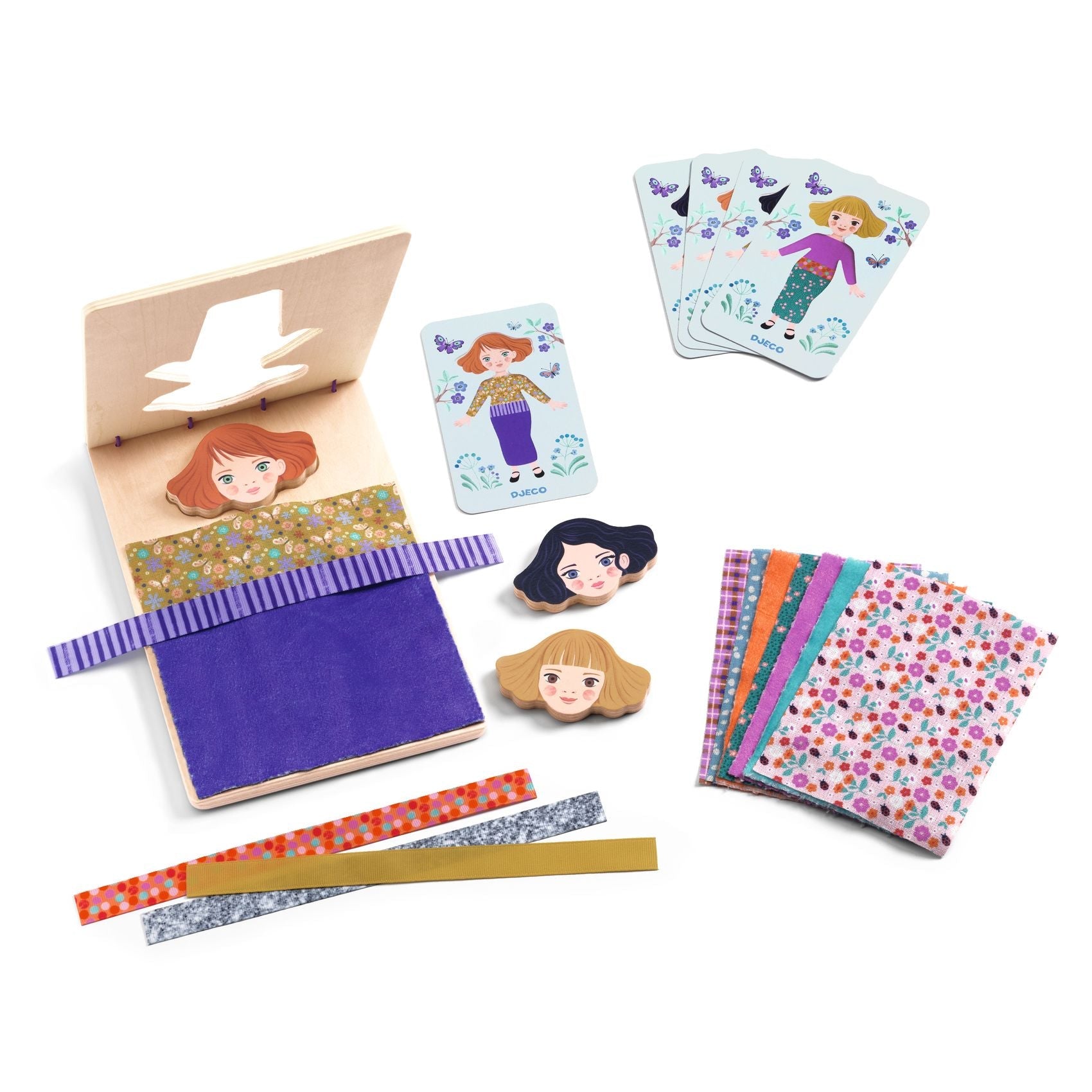 Ce set Djeco permet aux enfants de recréer une tenue de poupée à partir d'une carte, alliant précision, perspicacité et amusement.