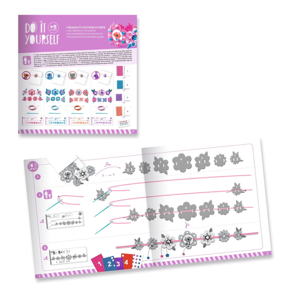Dans la boîte, vous trouverez tout ce dont vous avez besoin pour créer 4 magnifiques bracelets de l'amitié : de la feutrine douce, des autocollants en mousse brillante et des autocollants en forme de "galets" colorés.