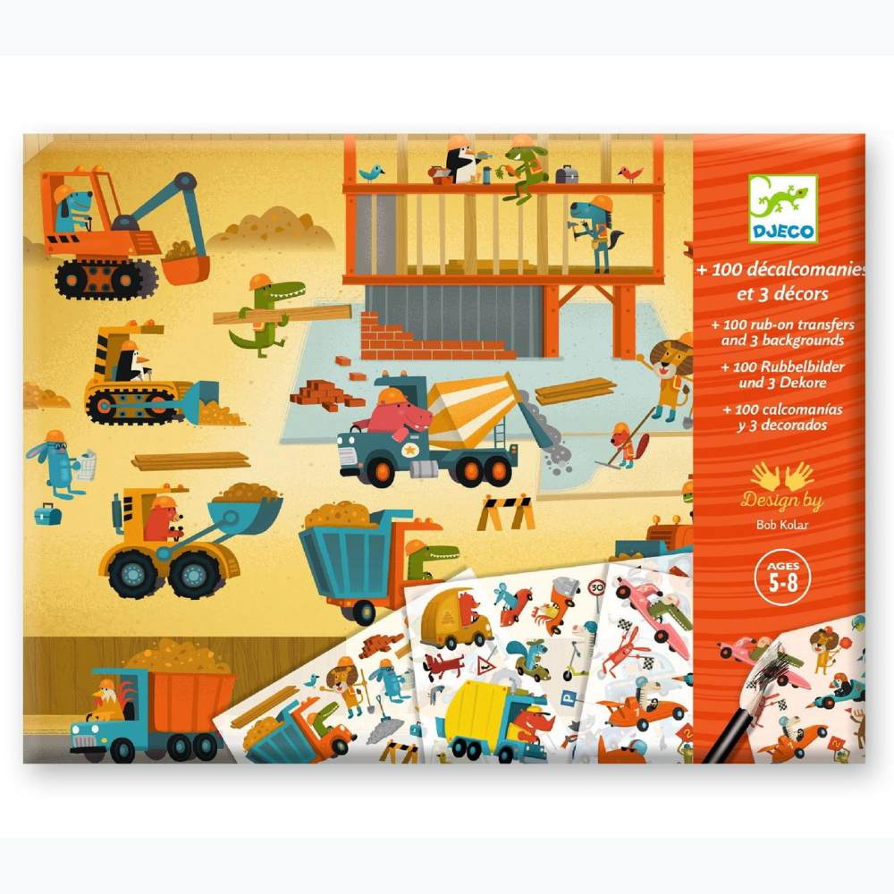Le jeu de décalcomanies Djeco emmène les enfants sur un chantier de construction, dans les rues d'une ville ou sur une piste de course.
