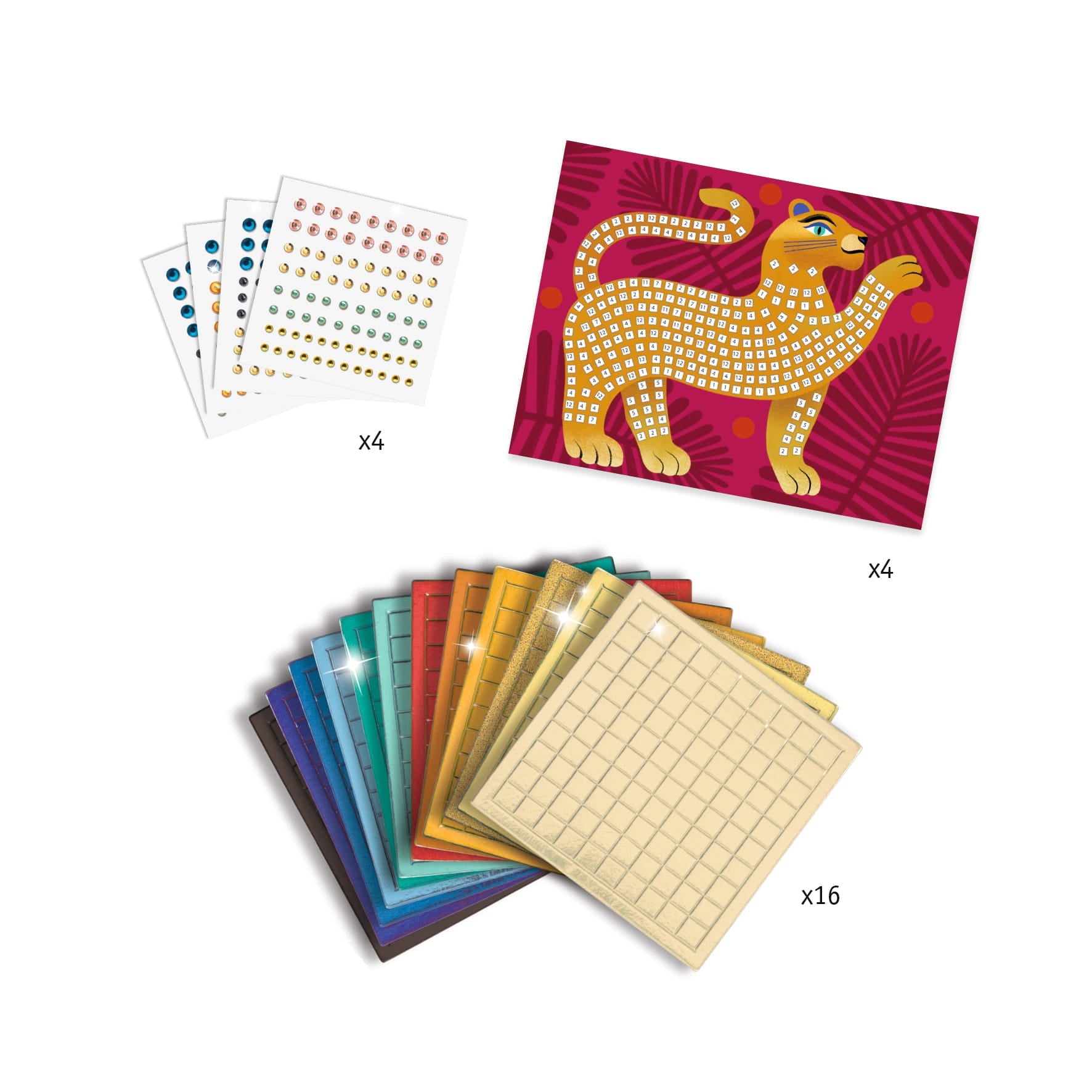 - Contenu du jeu: 4 gabarits, 16 planches avec mousse et mosaïques pailletées, 4 feuilles avec zircons