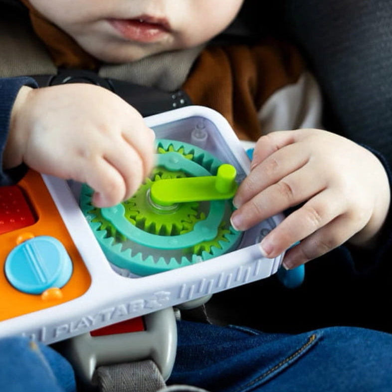 Le carré sensoriel PlayTab de Fat Brain Toys avec roues dentées est un jouet engageant qui invite votre enfant à explorer le mouvement, les relations et les sensations tactiles.