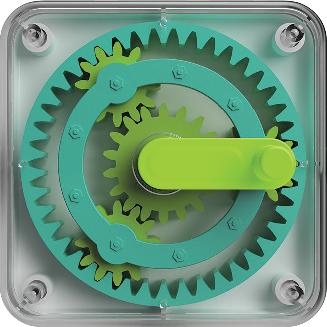 Grâce à un mécanisme actionné par une manivelle, un jeune enfant peut regarder la grande roue faire bouger les trois petites roues, ce qui lui procure une grande satisfaction et l'encourage à expérimenter.