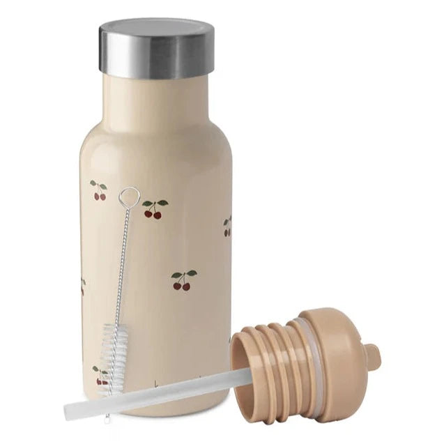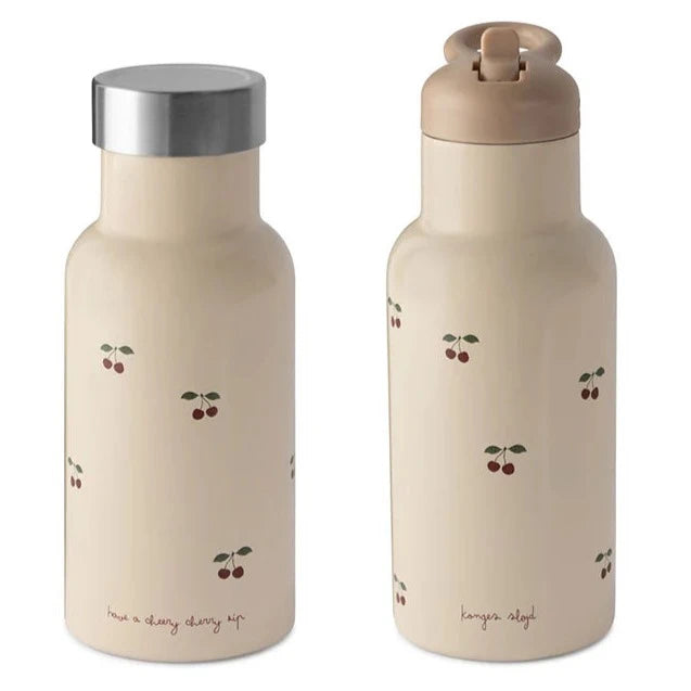 Une superbe bouteille isotherme Konges Sløjd pour enfants avec un joli design de cerise et deux bouchons interchangeables.