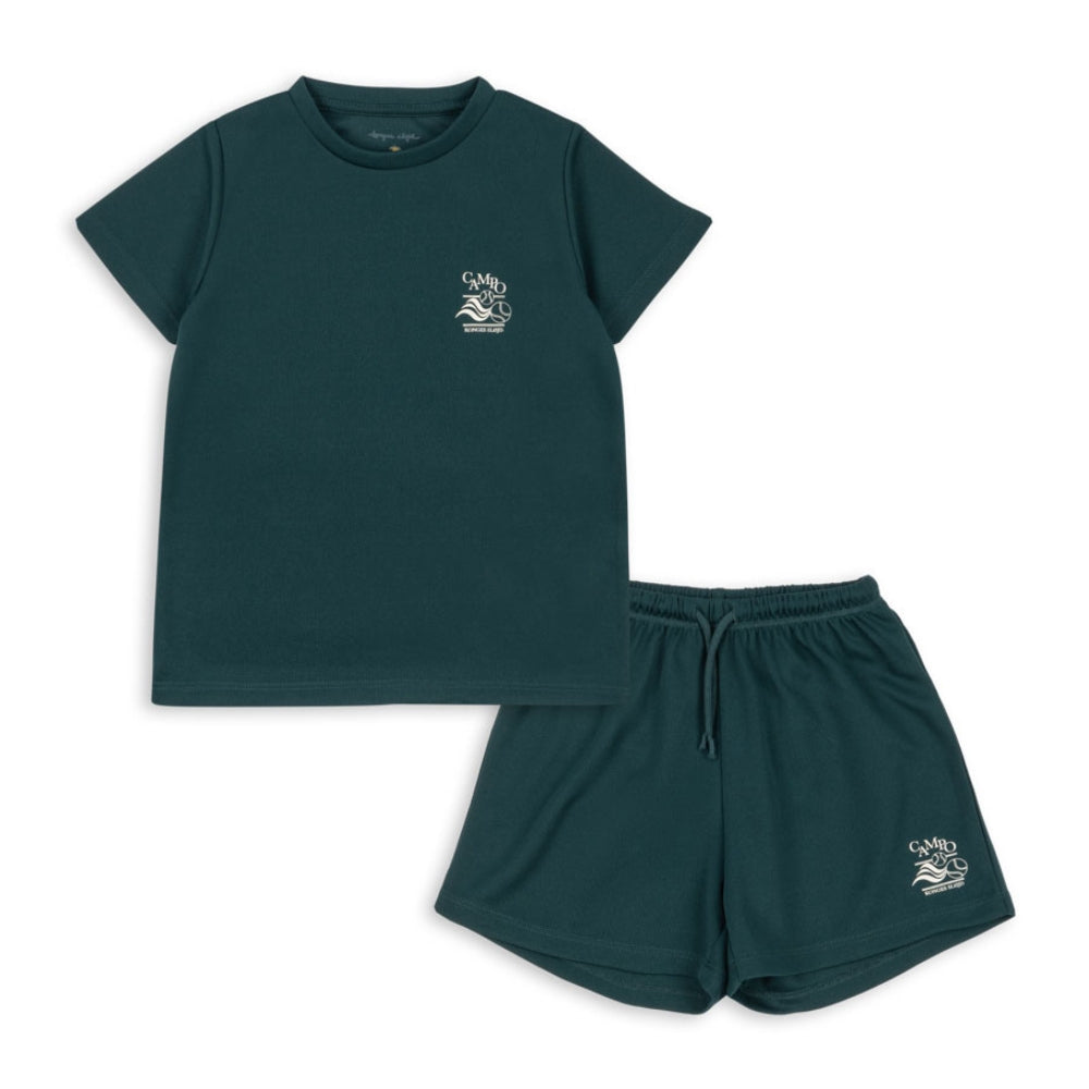 La matière est douce, respirante et sèche rapidement, pour que l'enfant se sente à l'aise toute la journée. Konges Slojd utilise du polyester recyclé de haute qualité pour cette conception, ce qui fait de cet ensemble un choix pratique et responsable.