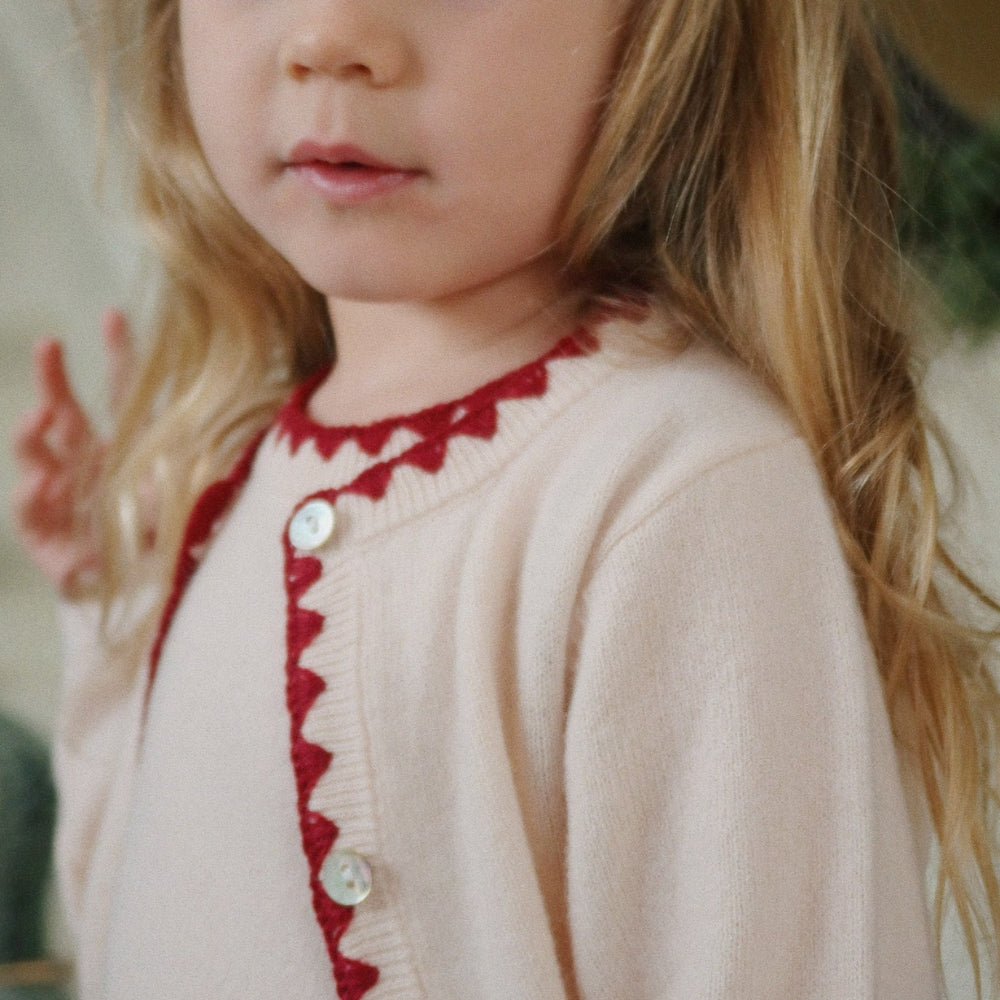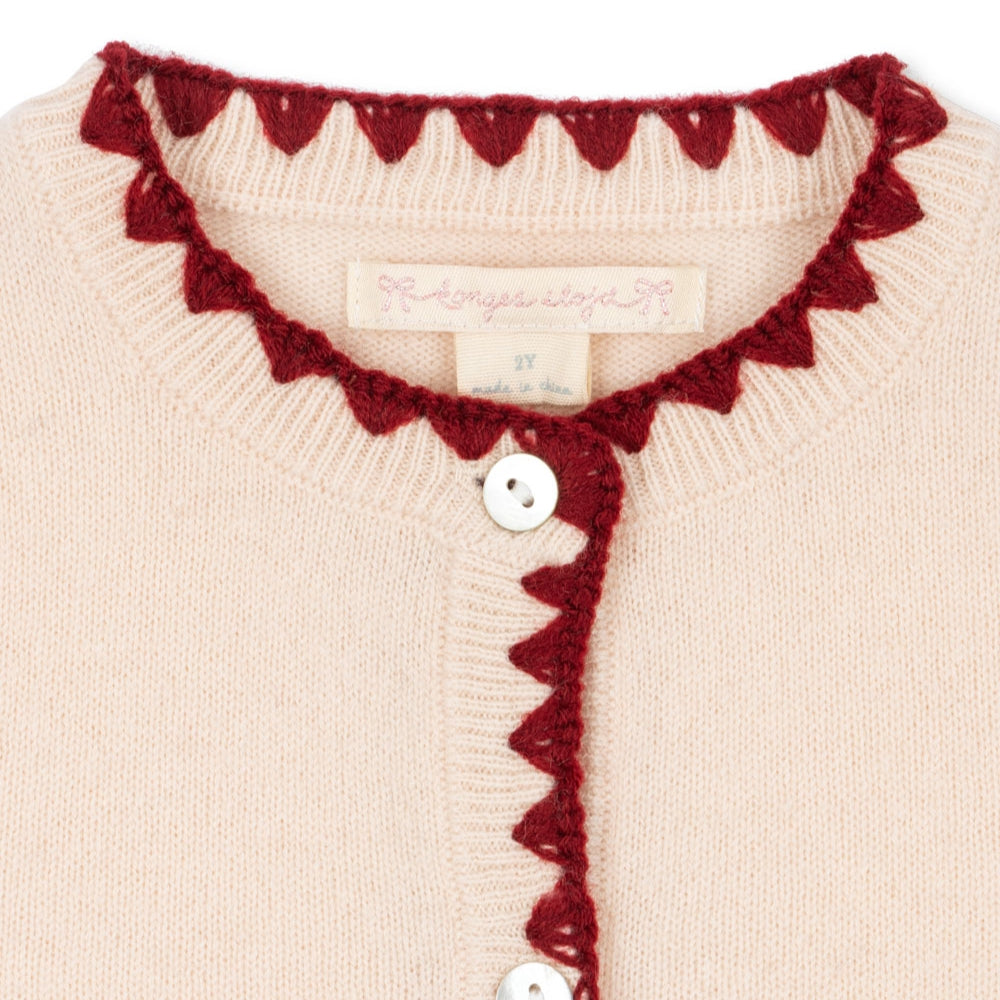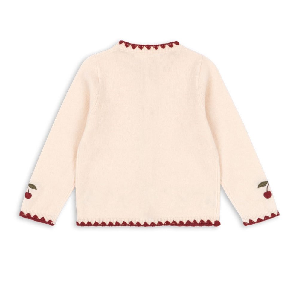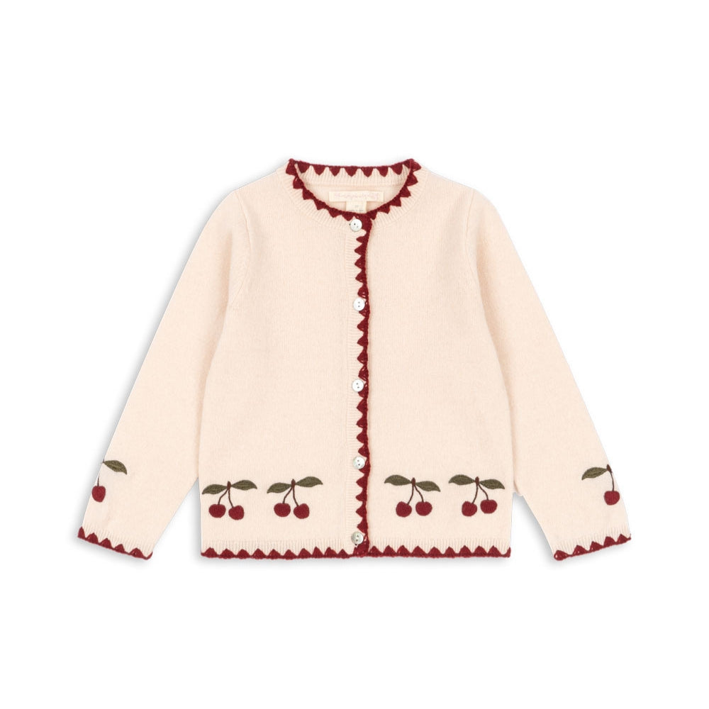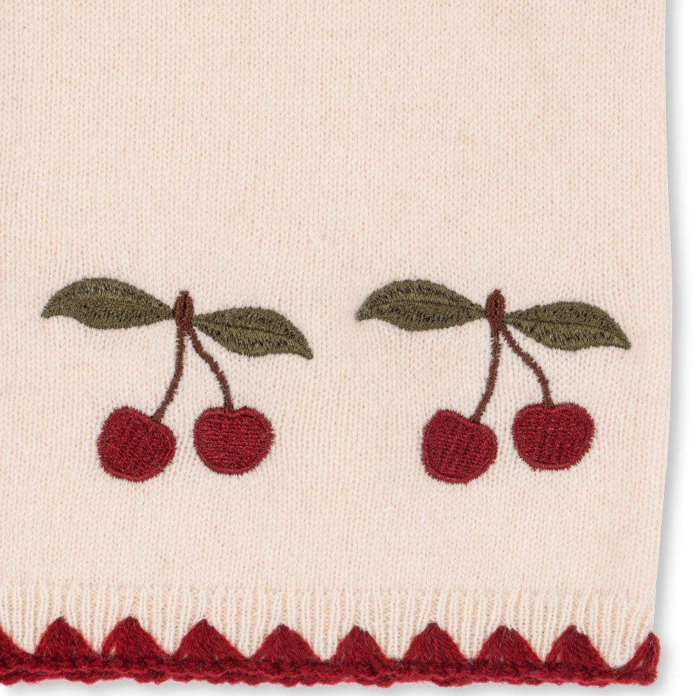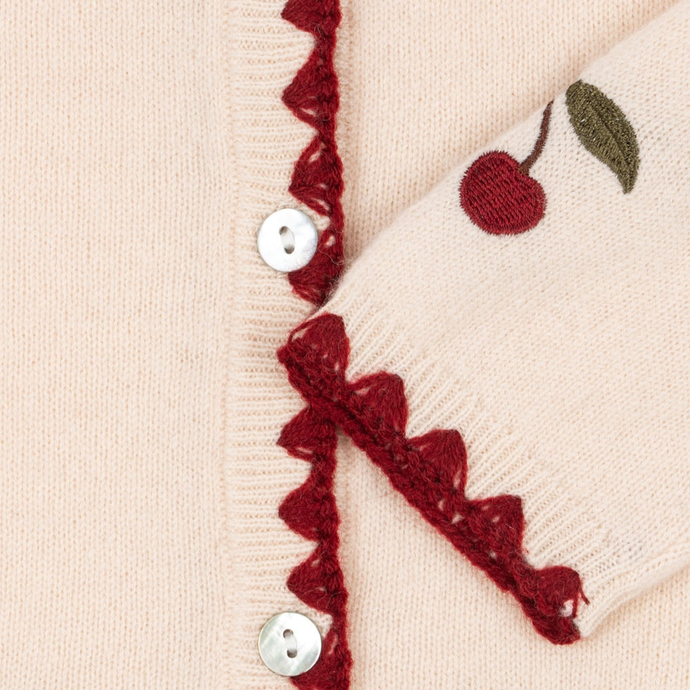 La broderie subtile en forme de cerise et les bordures contrastées lui confèrent un charme particulier, tandis que la fermeture à boutons en nacre ajoute une touche d'élégance.