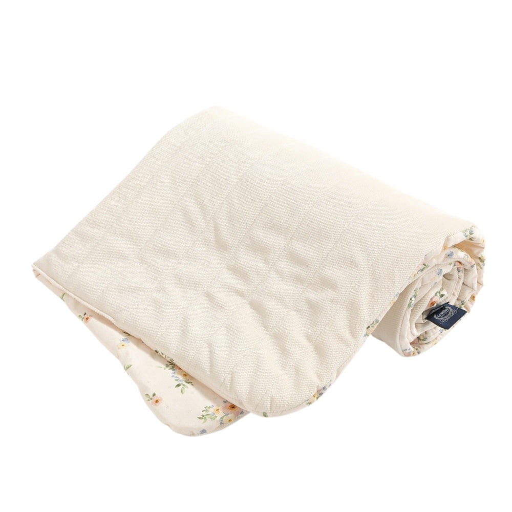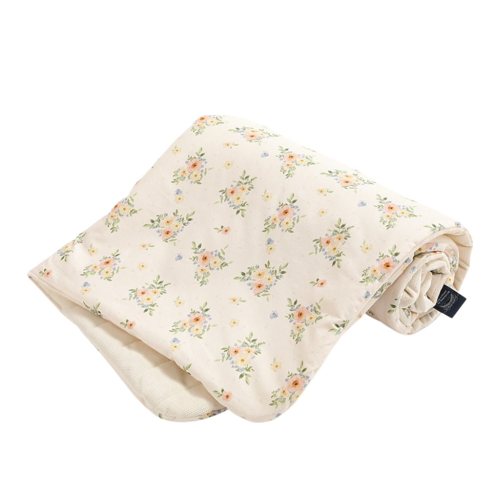 Une face de la couverture est fabriquée dans un coton respirant de la plus haute qualité, avec un magnifique motif floral de jardin anglais, tandis que l'autre face est fabriquée en velours matelassé incroyablement doux pour une sensation de luxe.