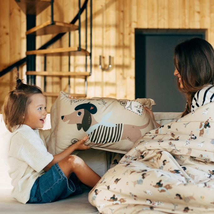 Parure de lit taille XL pour bébé avec le dessin de Pierre le chien de La Millou.