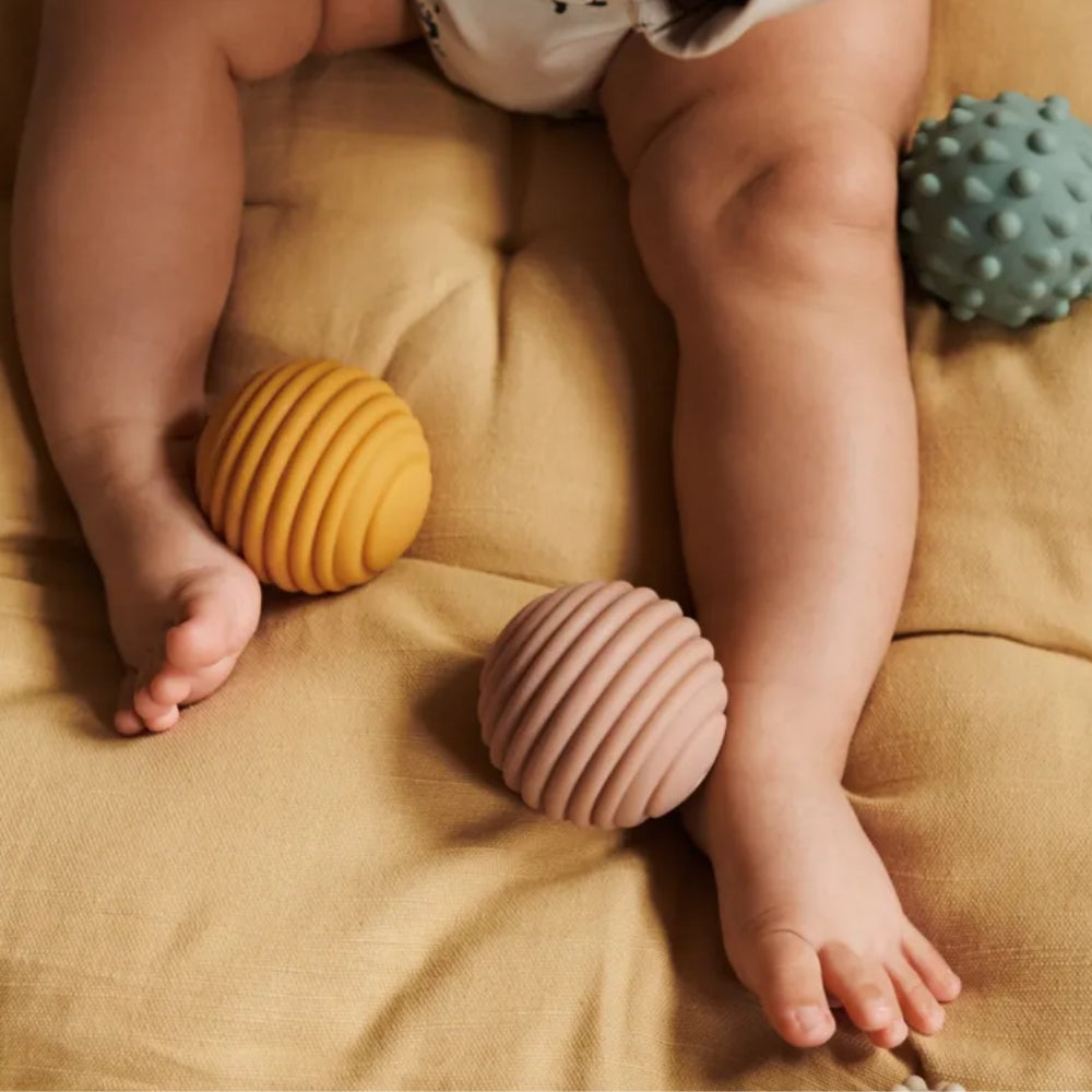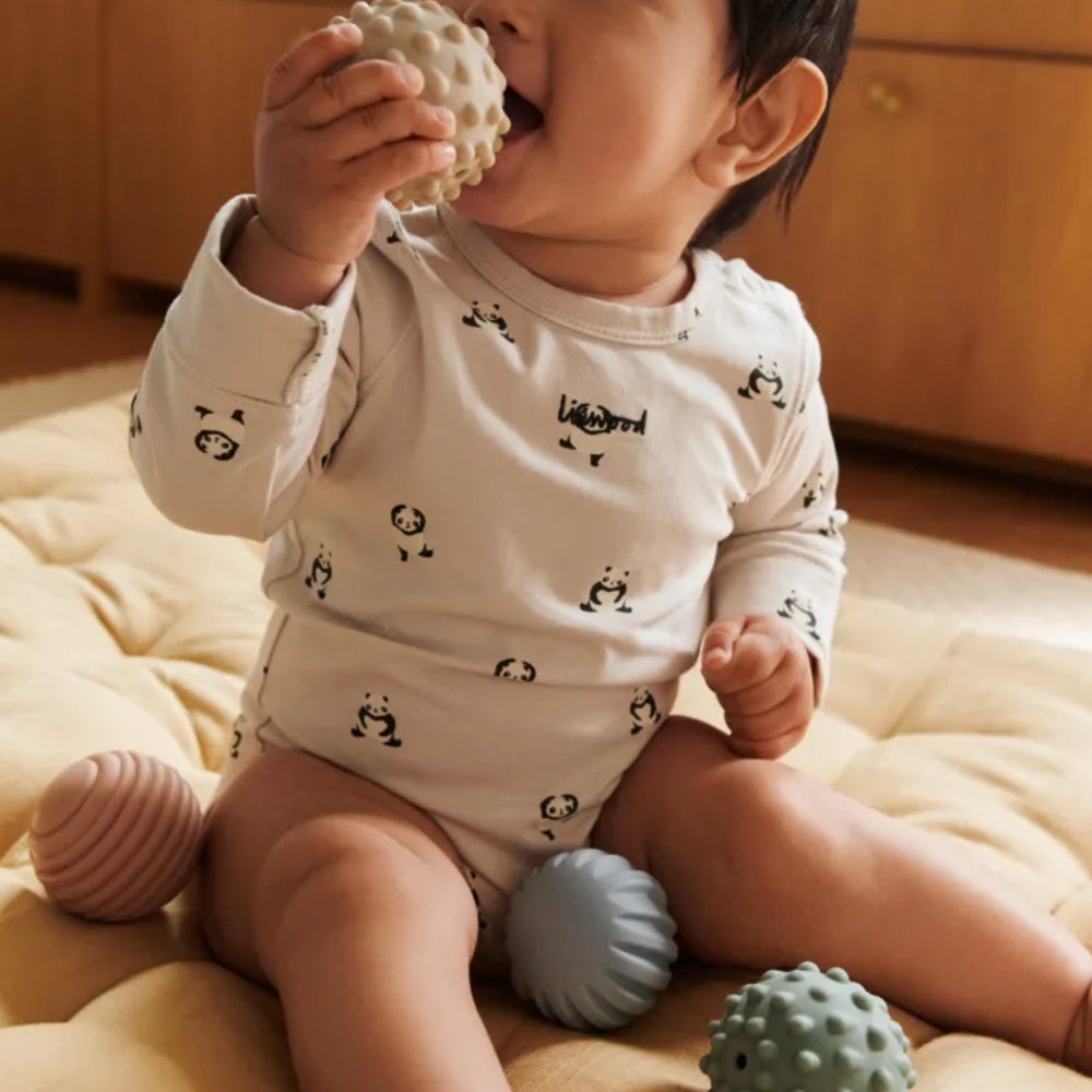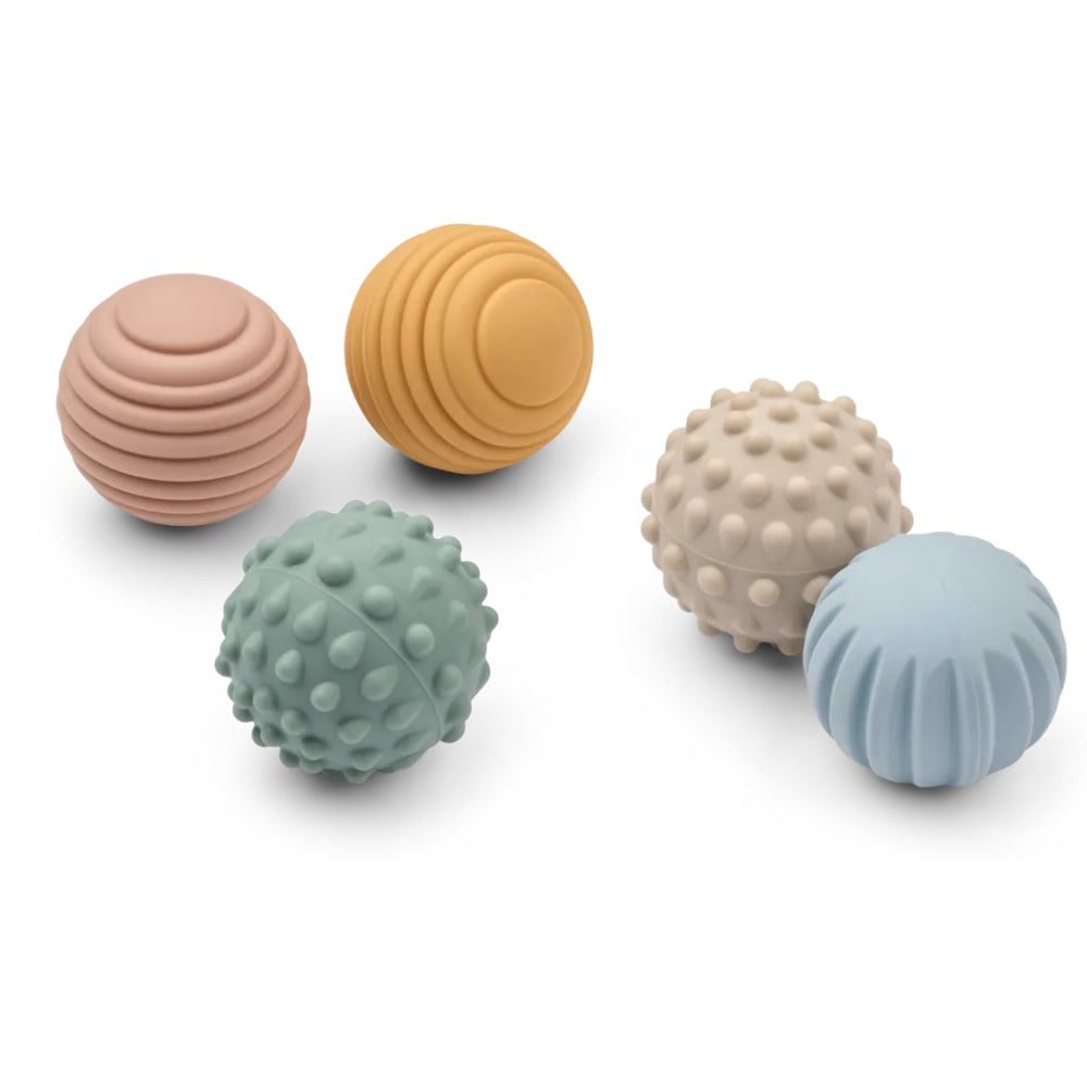 Liewood Sensory Balls est un ensemble de cinq balles douces aux textures différentes qui encouragent bébé à explorer le monde par le toucher.
