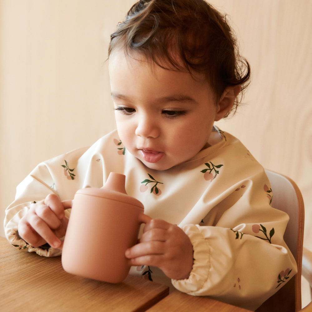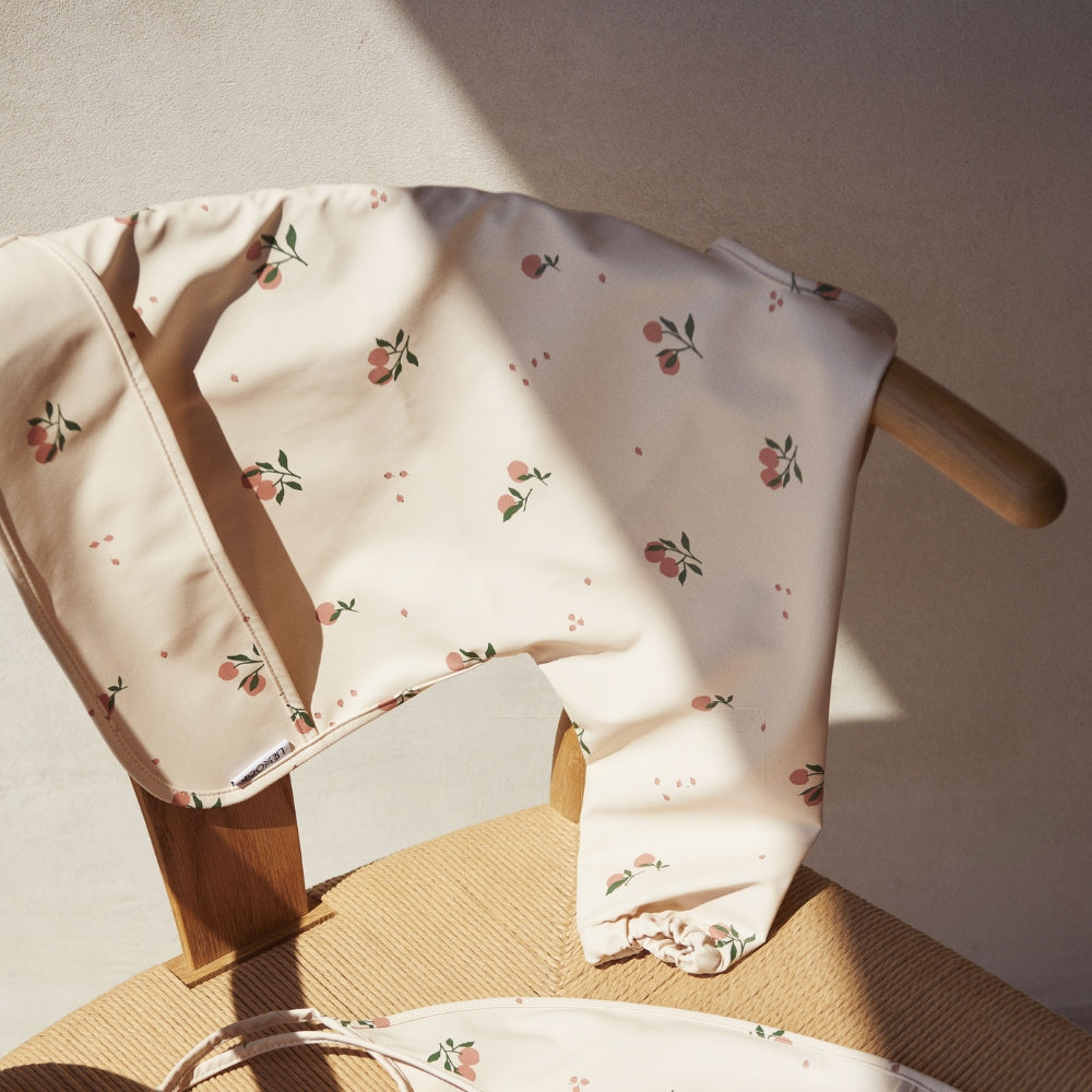 Le bavoir à manches Liewood a un joli motif pêche beige.