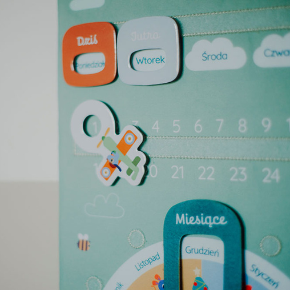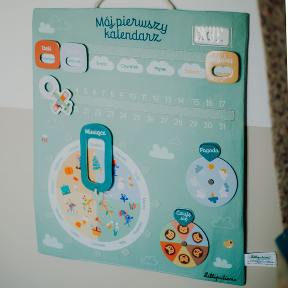 Ce tableau d'activités souple en version polonaise de Lilliputiens aidera votre enfant à s'habituer à la notion de temps et aux rituels quotidiens - des jours de la semaine aux saisons, en passant par les changements de temps et les émotions.