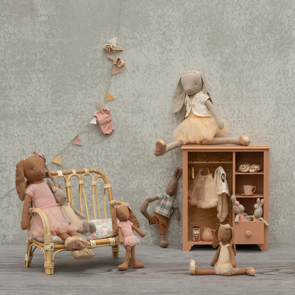 C'est l'endroit idéal pour ranger les vêtements des lapins, les ours en peluche ou les trésors les plus précieux de votre enfant. Grâce à sa taille, l'armoire miniature Maileg est parfaite pour une chambre d'enfant, tout en étant trop grande pour entrer dans les maisons de poupées de la marque.