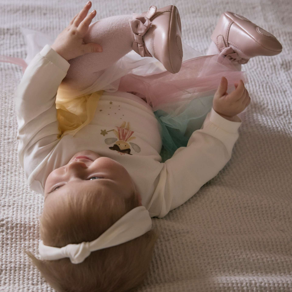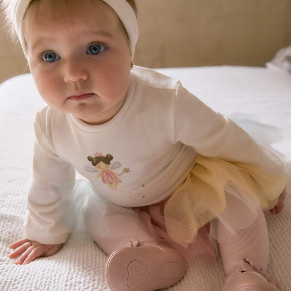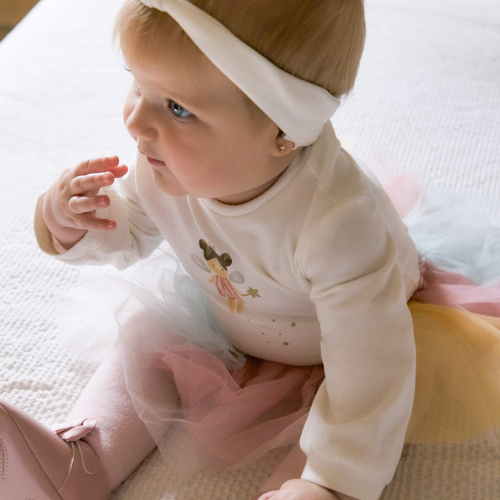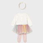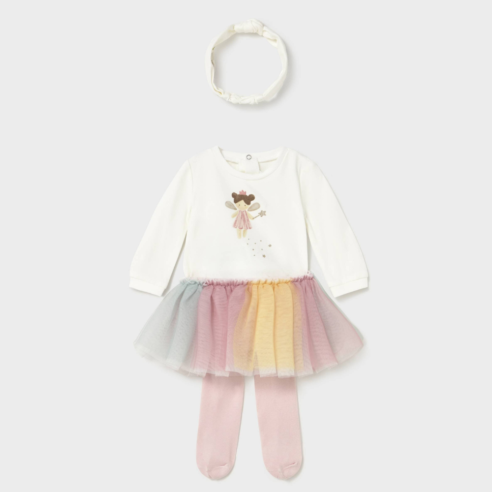 L'ensemble comprend trois pièces soigneusement conçues : un body à manches longues, des collants combinés à une jupe et un bandeau assorti.