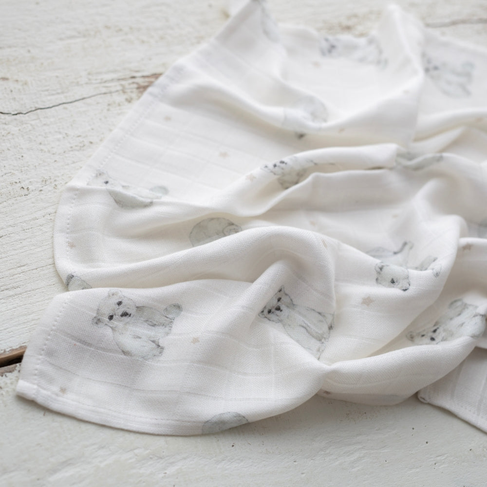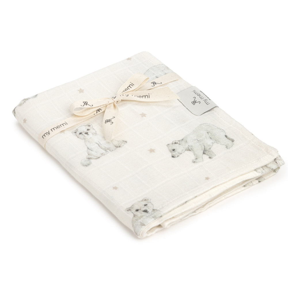 L'écharpe en mousseline de bambou 120x120 cm little bears de Memi est extrêmement douce et agréable au toucher.