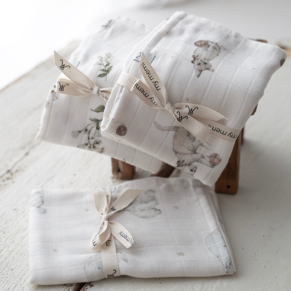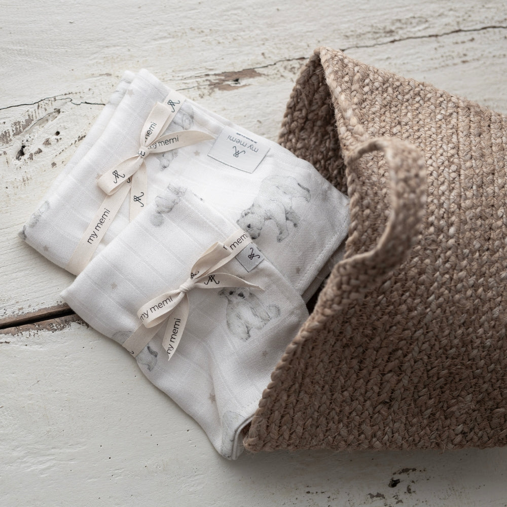 La couche en mousseline Memi peut également être utilisée comme bavoir et, pour les bébés plus âgés, comme écharpe de portage pour protéger leur cou du froid.
