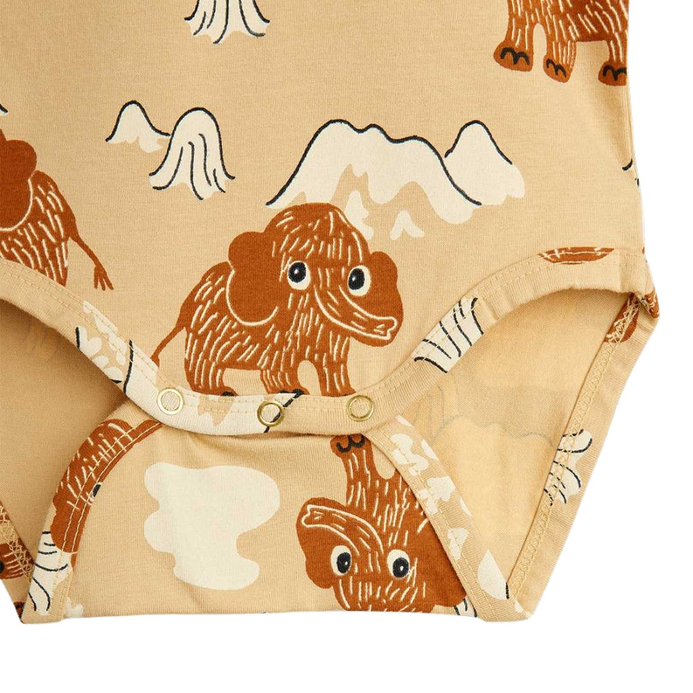 L'ensemble comprend un body à manches longues et un legging, tous deux décorés d'un imprimé amusant représentant de sympathiques mammouths dans un paysage de montagne.