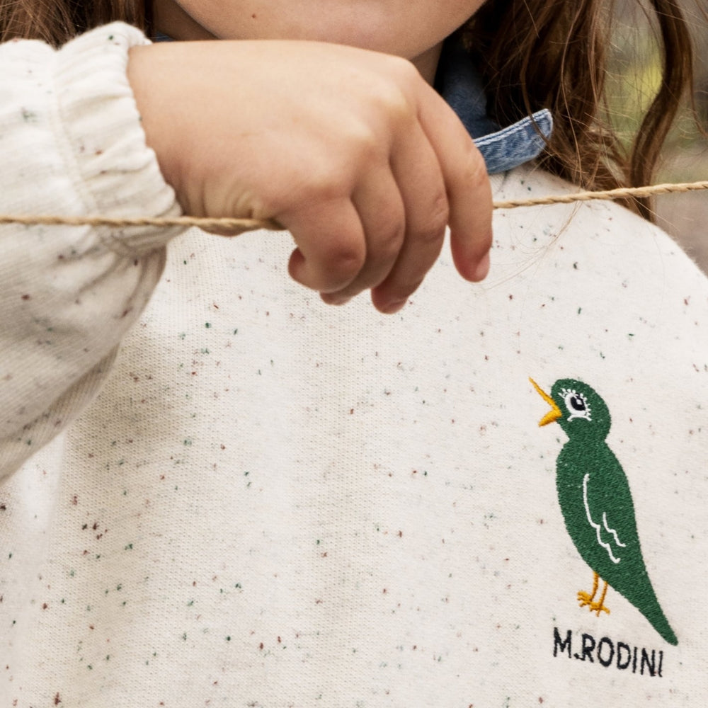 Le col côtelé accentue le style décontracté du sweat-shirt, tandis que le délicat écusson d'oiseau brodé sur la poitrine est un détail subtil mais distinctif, conforme à l'esthétique de la marque Mini Rodini.