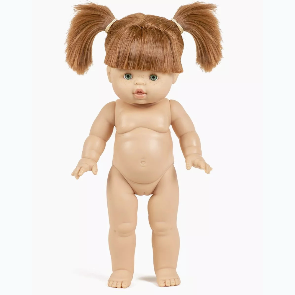 Elle a des cheveux roux attachés en queue de cheval, des yeux verts et se tient debout grâce à ses jambes droites, ce qui permet de la positionner facilement pour jouer à la maison ou à la crèche.